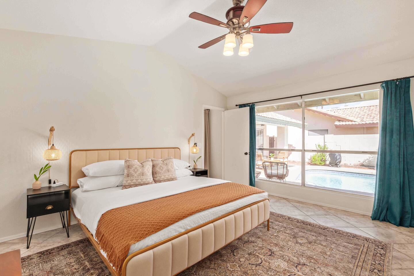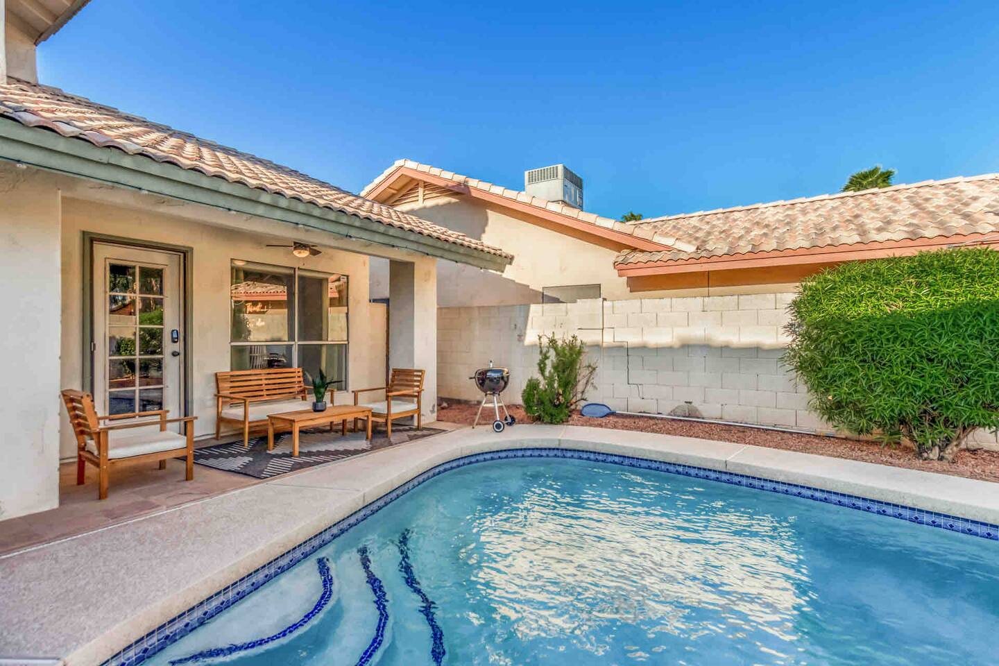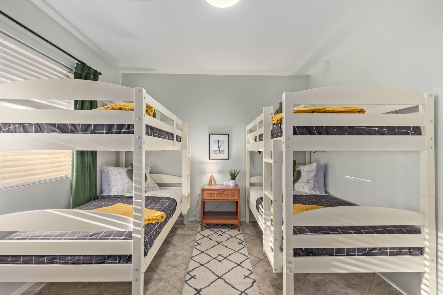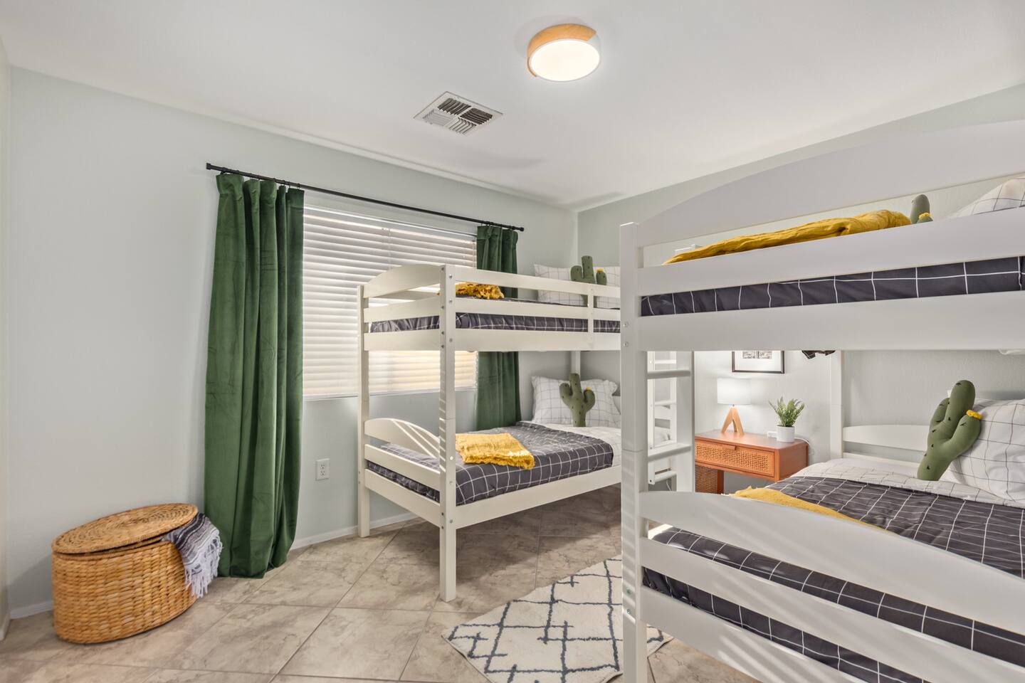 Our home sleeps 11 with 4 bedrooms and 2.5 baths. You'll find it's the perfect spot for a family or two, a group golf trip, or a guys’ or girls' trip. We have tastefully designed it to be a stylish yet cozy place to hang out. We have several great spaces where you'll enjoy lounging including the living room with a 65" TV, and spacious dining room that seats 8. If you choose to play a round of golf at one of the many nearby courses, challenge your friends to a putting contest on the newly installed putting green to wind down after a busy day. ACTIVITIES AND FOOD You can easily get to hiking trails, golf courses, sporting events, shopping, and top-notch restaurants. There is a tremendous food scene just minutes away in Downtown Chandler. If you are lucky enough to be here on a Saturday morning, you will be in for a treat at the Farmers' Market downtown. If you’re looking for a round of golf, there are too many options to count but the Ocotillo Golf Resort is one of our favorites and is 10 minutes South. Conveniently located by the freeway, you’ll have easy access to Scottsdale, Phoenix, and the surrounding areas. Family friendly attractions include the Phoenix Zoo, Aquarium, Main Event, TopGolf, and water parks. Check out our guidebook for a complete list of fun things to do including nightlife, food scene, golf courses, brunch spots, and family fun. If you are staying in, you can enjoy food delivery from a wide variety of local restaurants (one of our personal favorites is Flower Child!). You can also cook in our fully equipped kitchen. ENTERTAINMENT -Putting green -Lawn games -Foosball table -Swimming pool (Heated) -Charcoal Grill -Fast WiFi -65" smart TV in living room -58" smart TV in Fireplace Bedroom -55" smart TV in Master bedroom -55" smart TV in Queen bedroom -Sega Genesis -Board and card games BATHROOMS -Shampoo, conditioner, body soap, hair dryer, bath towels & pool towels LAUNDRY -Washer and dryer -Detergent -Ironing board and iron PARKING -Two spots in driveway -Free street parking KITCHEN -Pots, pans, toaster, mixing bowls, and baking dishes -Coffee and K-cup machine -Dish towels -Sharp Knives -Drinking Glasses, Wine glasses -Microwave -Dishwasher -Oven -Kettle DINING -Dining table seats 8 -Bar top seats 4 BEDROOMS -Master (main level): King bed, pool view, desk, walk-in closet, 55" smart TV, luggage stand, high-speed USB charging ports, ceiling fan -Bedroom 2 (main level): King bed, smart TV, luggage stand, high-speed USB charging ports, ceiling fan -Bedroom 3 (second floor): Queen bed, top-floor pool view, 55" smart TV, luggage stand, high-speed USB charging port, ceiling fan -Bedroom 4: (second floor): Two bunkbeds, high-speed USB charging ports