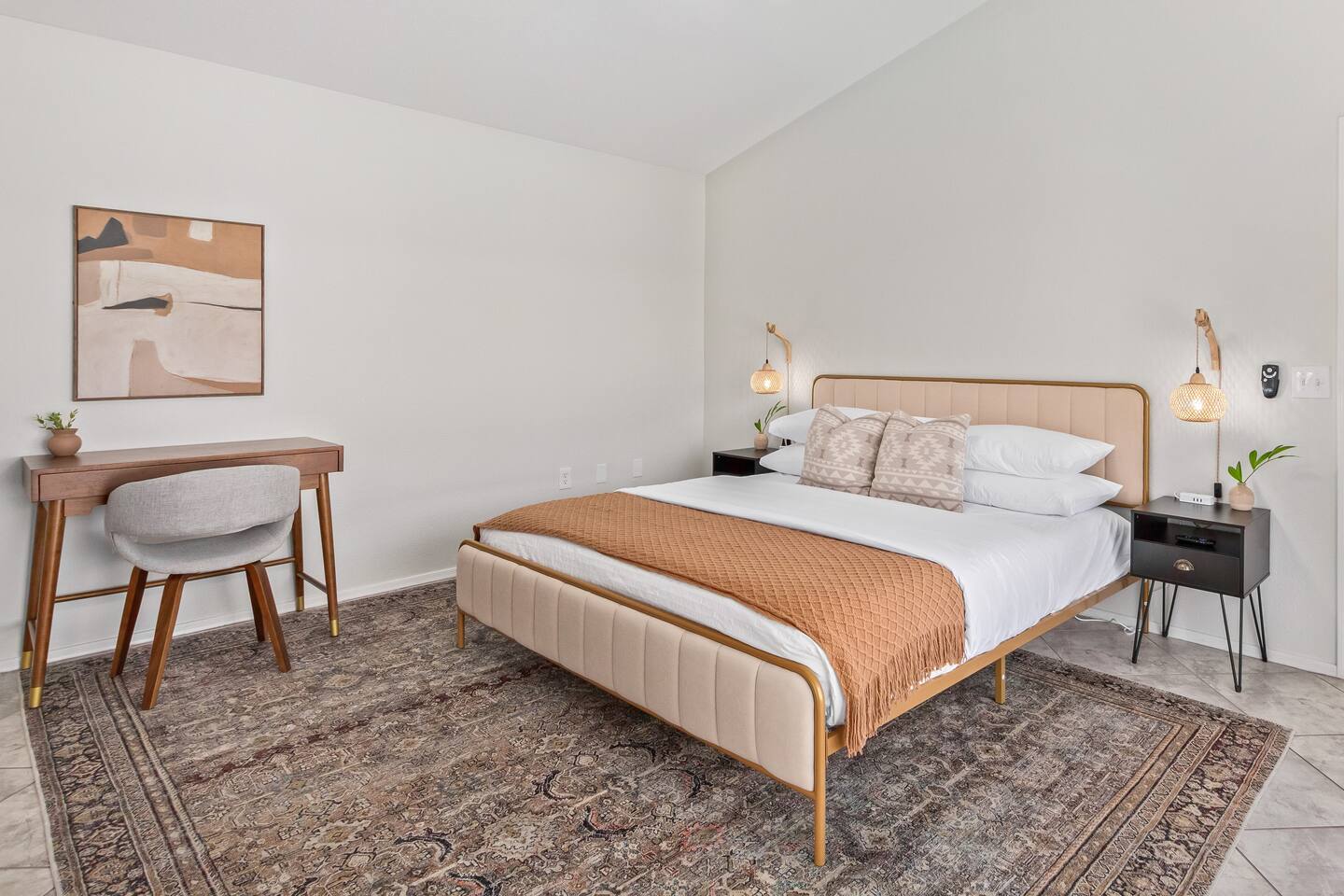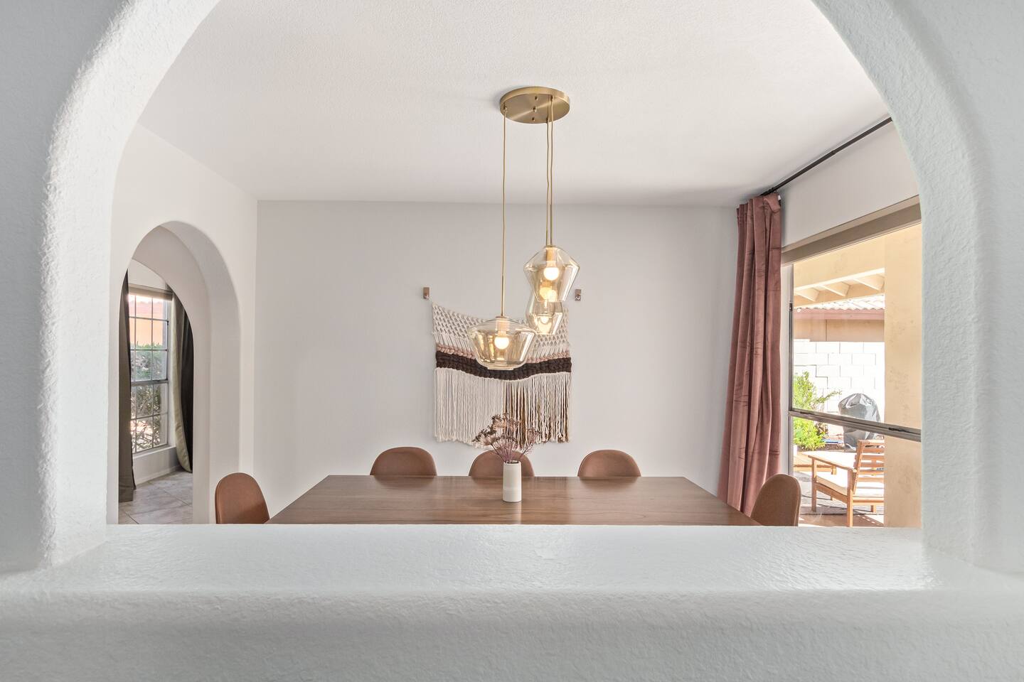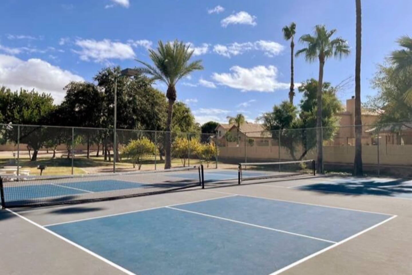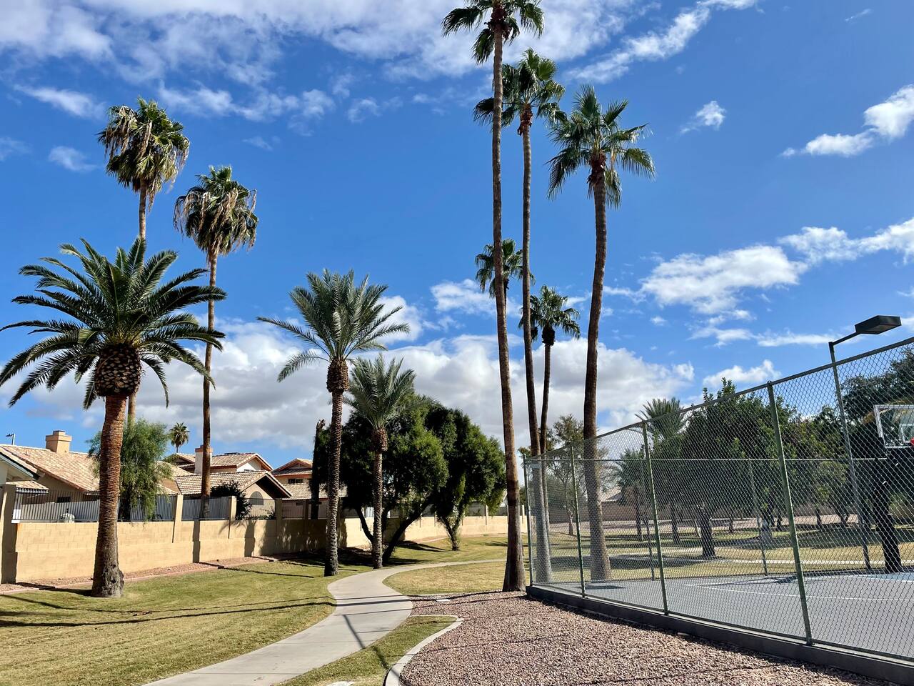 Just across the street from a park with a pickleball court, basketball court, and playground! The house is located in a quiet neighborhood where you'll see lots of cactuses and palm trees.