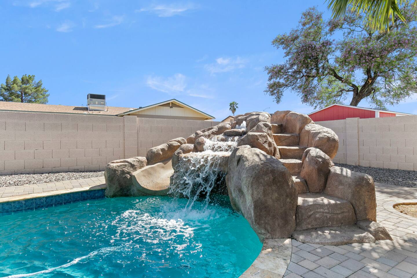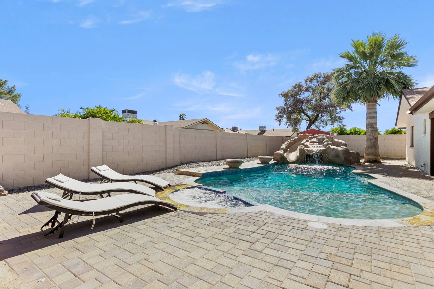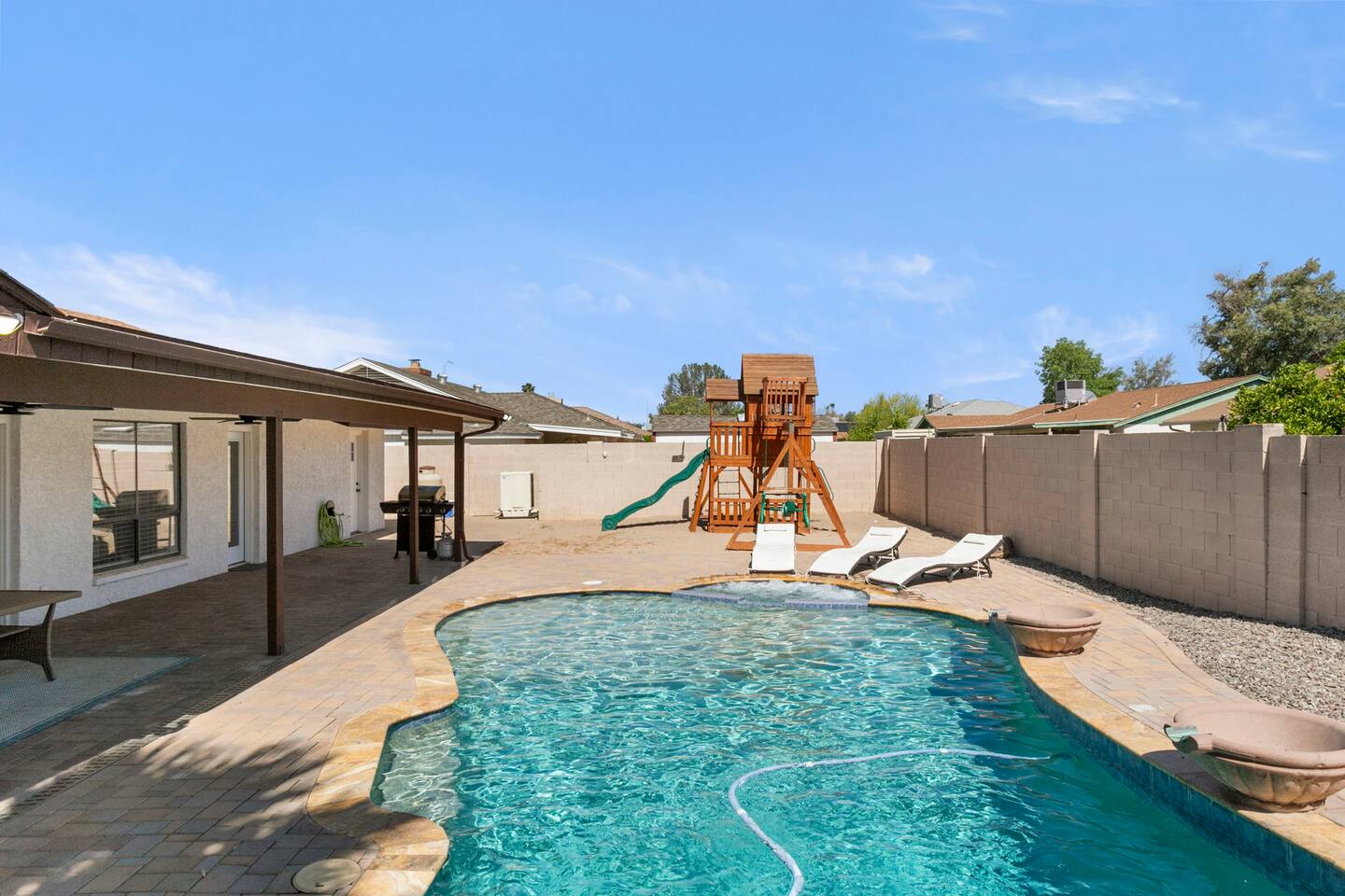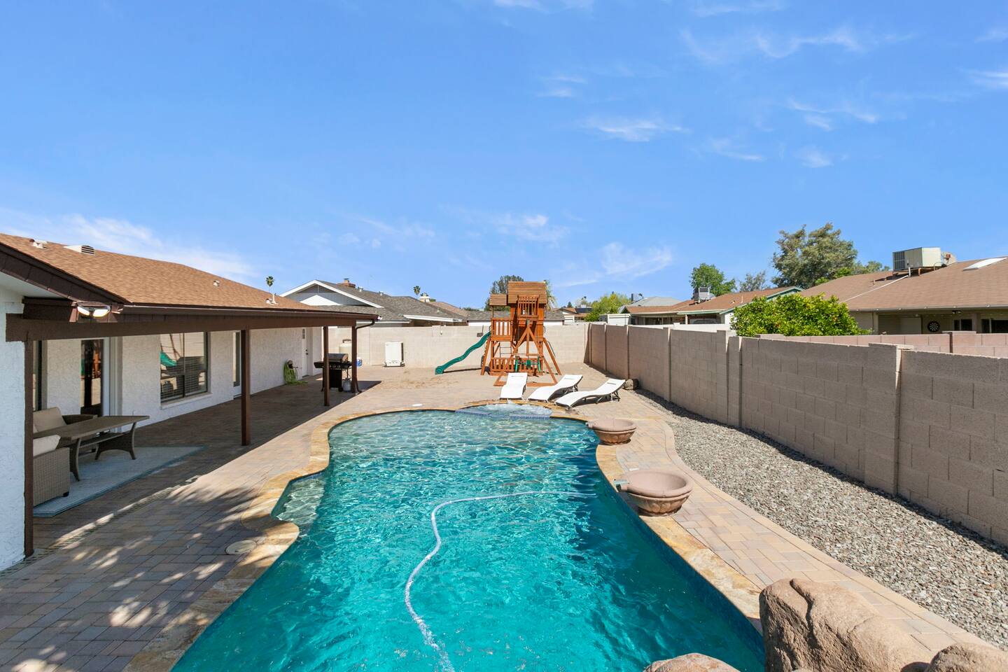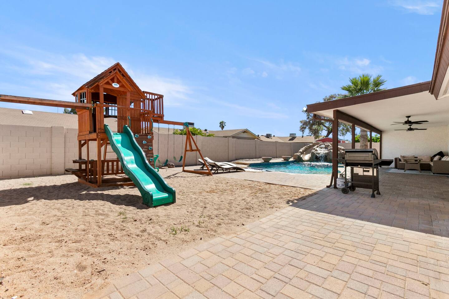 The Space Escape to Grove Oasis, which combines large square footage and custom design. Be prepared as this open-concept home will pull you right in. Upon entering the residence, you’ll notice the spacious floor plan welcoming you to make yourself right at home. Before sprinting to the pool, however, make sure to explore the spacious indoor living areas with beautiful bedrooms in which to kick back and relax away your travels. But don't rest too long - there's so much to do at this stylish home! Full Service Kitchen: Indulge in our modern full-service kitchen! With state-of-the-art appliances seamlessly integrated into the sleek, minimalist aesthetic, this culinary haven caters to every need. Whether you're a seasoned chef or an amateur cook, we welcome you to come spice up life! Living Room Area: Kick back and relax with the entire crew in the incredible living room space off the open concept kitchen and dining room. Large spacious L shaped sofa is the perfect space to stream your favorite shows on our 75" Smart TV while waiting for dinner with family and friends. Theatre/Bonus Room Area: Get ready for epic movie nights in our theater! We're talking an 86" screen that's basically life-sized, and a sound system that'll have you feeling every boom and whisper. So grab the popcorn, kick back, and let's turn movie nights into unforgettable adventures, right here at your home away from home. Bedrooms: Come sink into a cloud of comfort in our bedrooms! We use soft sheets and snuggly comforters that'll make you never want to leave. A King, Four Queens, and eight Bunk beds for the kiddos. Oh and a futon! Bring the gang and have maximum sleepover vibes. It's all about making your stay feel like a warm hug – cozy and totally awesome. In total we have A king, three Queens, and 2 sets of bunk beds for the kiddos. Please note that Bedroom 1 has extra wide 36" doors for step-less outdoor entry, bathroom, and kitchen access. Direct access to a connected full bath that has a step-free door-less extra wide shower ramp and a heavy duty adjustable height plastic shower bench w/ backrest and shower handles. Bathrooms: Fresh and fabulous, our remodeled bathrooms are here to elevate your stay! Four full bathrooms so that sharing is limited! Fluffy towels, modern vibes – it's all set to make you feel pampered and right at home. Outdoor Space: Dive into the ultimate chill zone for our house guests! The pool's got it all - a slide that's all about fun, a spa that's pure relaxation, and a cool waterfall corner for those lazy vibes. It's all here, so grab your swimsuit and let's make some splashy memories. After a nice dip, the kids' playhouse is ready for adventure, while the BBQ grill is sizzling for your outdoor feast. Throw down with Corn hole or outdoor Jenga! Pool/Hot Tub: Please note that the pool and spa/hot tub heat cannot be turned on at the same time. These are automated and controlled on our end. If the pool heat is currently on and you'd like to switch to the hot tub, simply send us a message, and we’ll be happy to turn it on for you. We're committed to ensuring you have the best experience possible, so don't hesitate to reach out if you have any questions! Other things to note Entertainment is available at the property: *86" TV Theatre room with sound system *Pool w/ waterslide/fountains/waterfall, Spa *Play-set, outdoor toys *Games, board/card games. Parking Instructions: 2 cars in driveway, 2 cars on street by the house. Nestled in Mesa, you’ll have easy access to the finest dining, entertainment, and major freeways to travel the Phoenix valley as you please. Following are a list of close by attractions: Emerald Park: A 3 minute walk will land you at Emerald Park. Over 16 acres of green grass with lots of fun options including: Disk Golf , Basketball Courts, Picnic Tables/Grills, a Playground, and more! Look for our disk golf set in the outdoor toys. Mother Nature's Farm: Just a 3 minute drive down the road is Mother Nature's Farm. Special seasonal activities can be found here! Pumpkin patches, a hay bale maze, a cozy farm boutique, and an animal petting area make this a great memory and photoshoot! Local Golf: Hit up the many nearby golf courses that are just a few miles away! Downtown Gilbert:Make sure to visit the lively nightlife of Gilbert. Just an 8 minute drive south, the town offers many pubs and restaurants. Just take Gilbert Rd south. You can't miss it! Mesa Arts Center:Ten minutes Northwest will take you to the Mesa Arts Center. Make sure to check the many events, concerts, and exhibitions! A local favorite. Golfland Sunsplash Waterpark:Cool off with the family favorite waterpark! Just 8 minutes west and you'll be slippin' and slidin'! Mini golf is also available for a quick match! There are many stores nearby to stock up with. All within a 5 minute drive or less so that you spend less time shopping and more time relaxing! Bedroom 1 has extra wide 36" doors for step-less outdoor entry, bathroom, and kitchen access. Direct access to a connected full bath that has a step-free door-less extra wide shower ramp and a heavy duty adjustable height plastic shower bench w/ backrest and shower handles. TPT License #21525826 Mesa City License #LIC23-08035