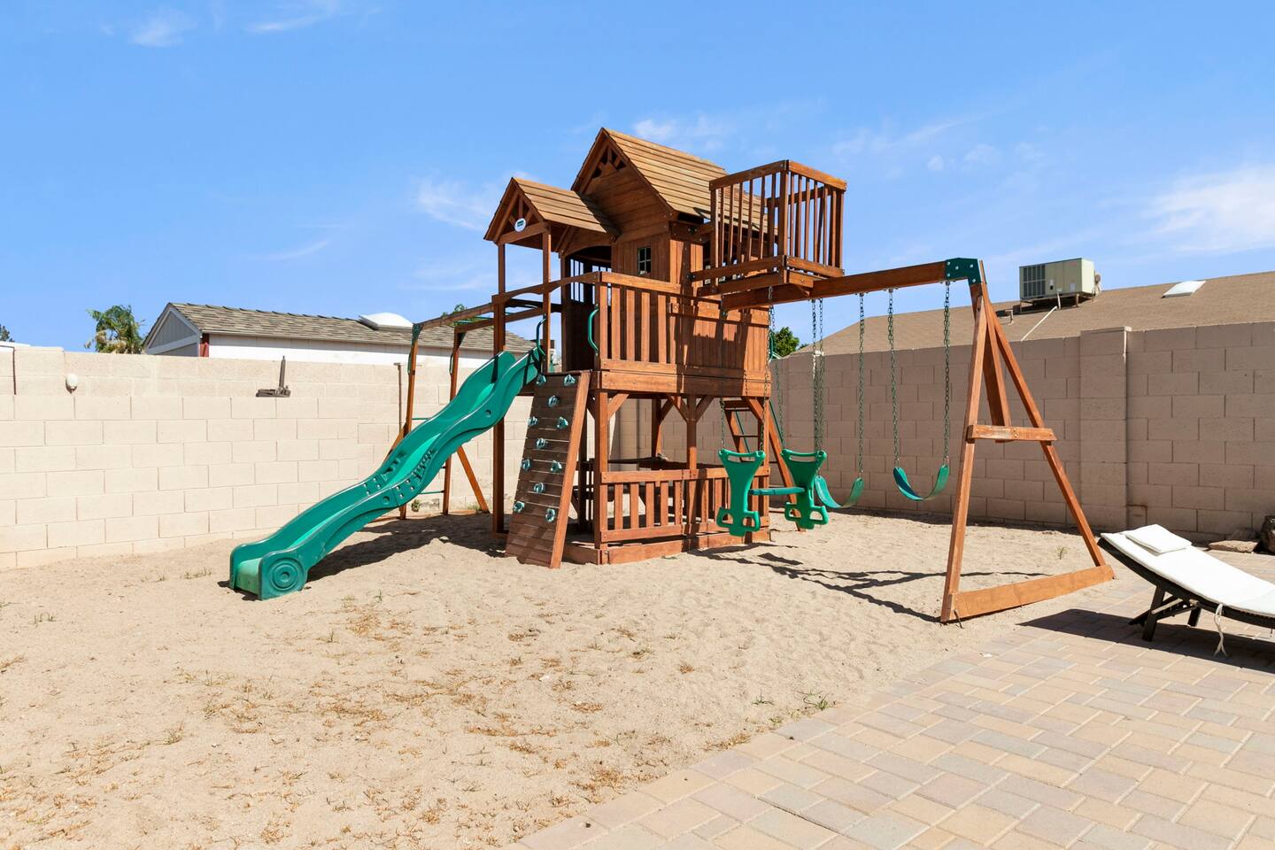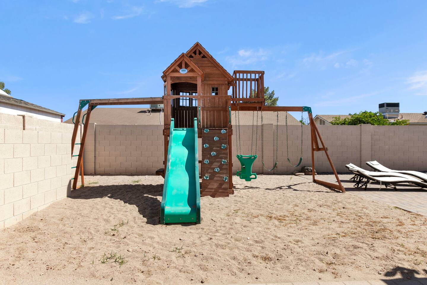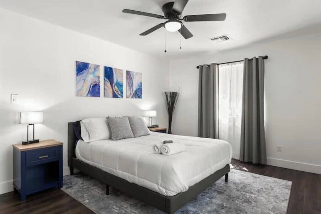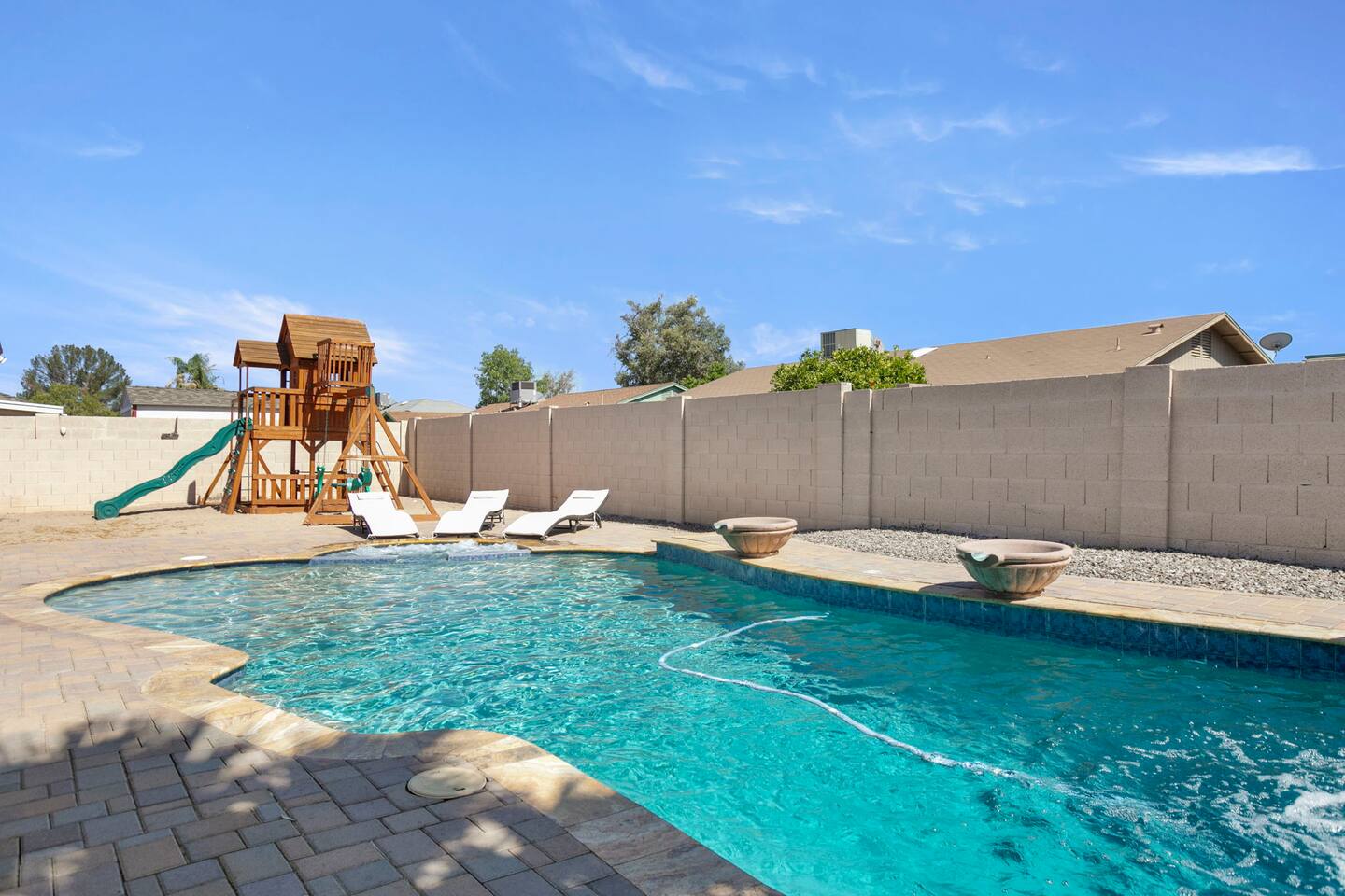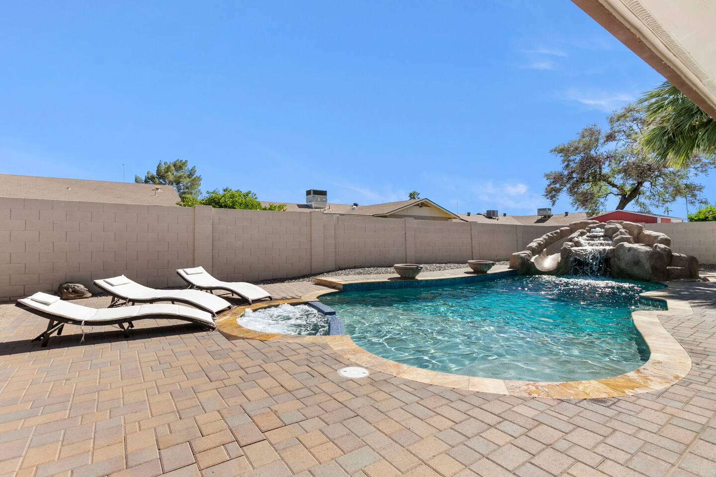 The Space Escape to Grove Oasis, which combines large square footage and custom design. Be prepared as this open-concept home will pull you right in. Upon entering the residence, you’ll notice the spacious floor plan welcoming you to make yourself right at home. Before sprinting to the pool, however, make sure to explore the spacious indoor living areas with beautiful bedrooms in which to kick back and relax away your travels. But don't rest too long - there's so much to do at this stylish home! Full Service Kitchen: Indulge in our modern full-service kitchen! With state-of-the-art appliances seamlessly integrated into the sleek, minimalist aesthetic, this culinary haven caters to every need. Whether you're a seasoned chef or an amateur cook, we welcome you to come spice up life! Living Room Area: Kick back and relax with the entire crew in the incredible living room space off the open concept kitchen and dining room. Large spacious L shaped sofa is the perfect space to stream your favorite shows on our 75" Smart TV while waiting for dinner with family and friends. Theatre/Bonus Room Area: Get ready for epic movie nights in our theater! We're talking an 86" screen that's basically life-sized, and a sound system that'll have you feeling every boom and whisper. So grab the popcorn, kick back, and let's turn movie nights into unforgettable adventures, right here at your home away from home. Bedrooms: Come sink into a cloud of comfort in our bedrooms! We use soft sheets and snuggly comforters that'll make you never want to leave. A King, Four Queens, and eight Bunk beds for the kiddos. Oh and a futon! Bring the gang and have maximum sleepover vibes. It's all about making your stay feel like a warm hug – cozy and totally awesome. In total we have A king, three Queens, and 2 sets of bunk beds for the kiddos. Please note that Bedroom 1 has extra wide 36" doors for step-less outdoor entry, bathroom, and kitchen access. Direct access to a connected full bath that has a step-free door-less extra wide shower ramp and a heavy duty adjustable height plastic shower bench w/ backrest and shower handles. Bathrooms: Fresh and fabulous, our remodeled bathrooms are here to elevate your stay! Four full bathrooms so that sharing is limited! Fluffy towels, modern vibes – it's all set to make you feel pampered and right at home. Outdoor Space: Dive into the ultimate chill zone for our house guests! The pool's got it all - a slide that's all about fun, a spa that's pure relaxation, and a cool waterfall corner for those lazy vibes. It's all here, so grab your swimsuit and let's make some splashy memories. After a nice dip, the kids' playhouse is ready for adventure, while the BBQ grill is sizzling for your outdoor feast. Throw down with Corn hole or outdoor Jenga! Pool/Hot Tub: Please note that the pool and spa/hot tub heat cannot be turned on at the same time. These are automated and controlled on our end. If the pool heat is currently on and you'd like to switch to the hot tub, simply send us a message, and we’ll be happy to turn it on for you. We're committed to ensuring you have the best experience possible, so don't hesitate to reach out if you have any questions! Other things to note Entertainment is available at the property: *86" TV Theatre room with sound system *Pool w/ waterslide/fountains/waterfall, Spa *Play-set, outdoor toys *Games, board/card games. Parking Instructions: 2 cars in driveway, 2 cars on street by the house. Nestled in Mesa, you’ll have easy access to the finest dining, entertainment, and major freeways to travel the Phoenix valley as you please. Following are a list of close by attractions: Emerald Park: A 3 minute walk will land you at Emerald Park. Over 16 acres of green grass with lots of fun options including: Disk Golf , Basketball Courts, Picnic Tables/Grills, a Playground, and more! Look for our disk golf set in the outdoor toys. Mother Nature's Farm: Just a 3 minute drive down the road is Mother Nature's Farm. Special seasonal activities can be found here! Pumpkin patches, a hay bale maze, a cozy farm boutique, and an animal petting area make this a great memory and photoshoot! Local Golf: Hit up the many nearby golf courses that are just a few miles away! Downtown Gilbert:Make sure to visit the lively nightlife of Gilbert. Just an 8 minute drive south, the town offers many pubs and restaurants. Just take Gilbert Rd south. You can't miss it! Mesa Arts Center:Ten minutes Northwest will take you to the Mesa Arts Center. Make sure to check the many events, concerts, and exhibitions! A local favorite. Golfland Sunsplash Waterpark:Cool off with the family favorite waterpark! Just 8 minutes west and you'll be slippin' and slidin'! Mini golf is also available for a quick match! There are many stores nearby to stock up with. All within a 5 minute drive or less so that you spend less time shopping and more time relaxing! Bedroom 1 has extra wide 36" doors for step-less outdoor entry, bathroom, and kitchen access. Direct access to a connected full bath that has a step-free door-less extra wide shower ramp and a heavy duty adjustable height plastic shower bench w/ backrest and shower handles. TPT License #21525826 Mesa City License #LIC23-08035