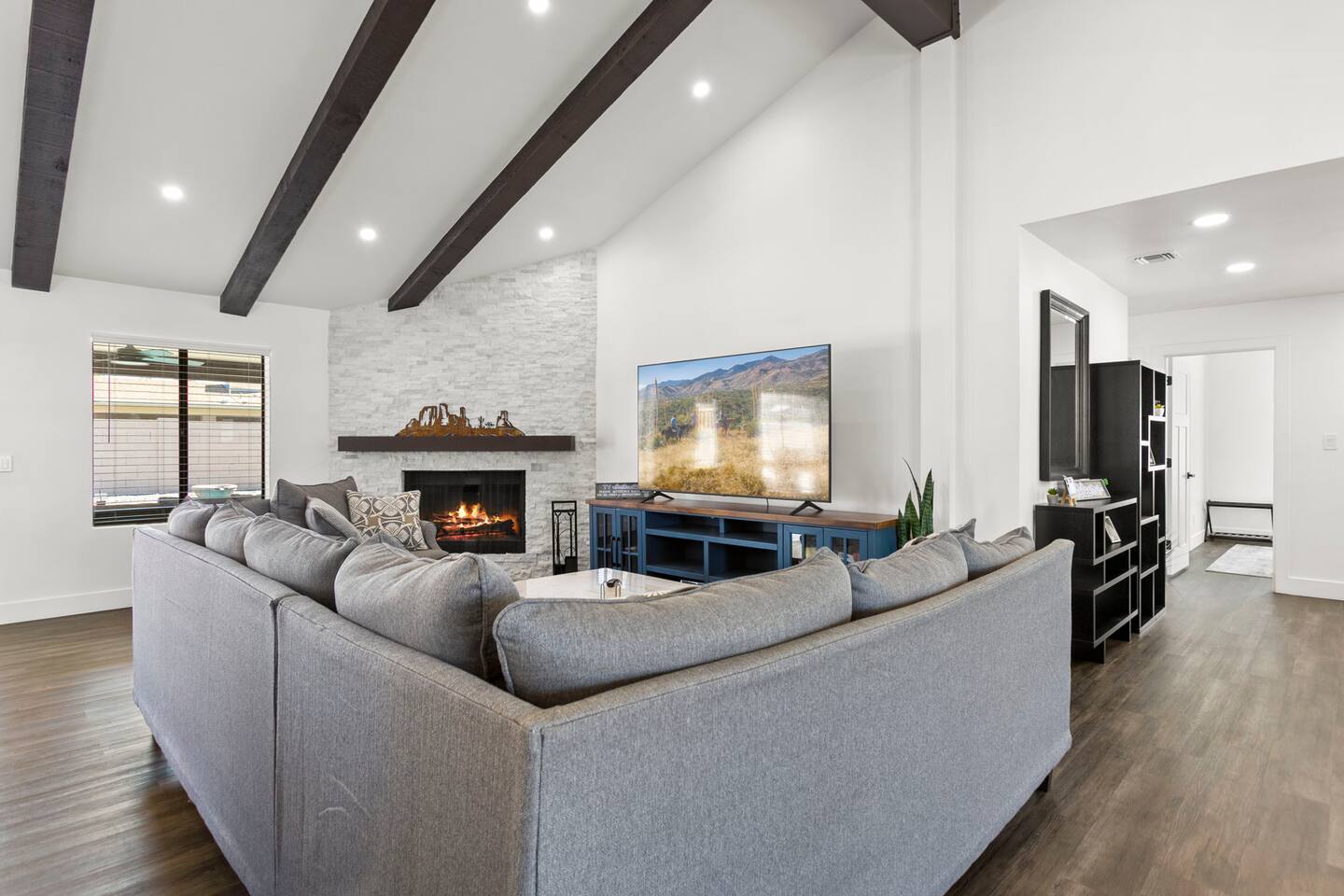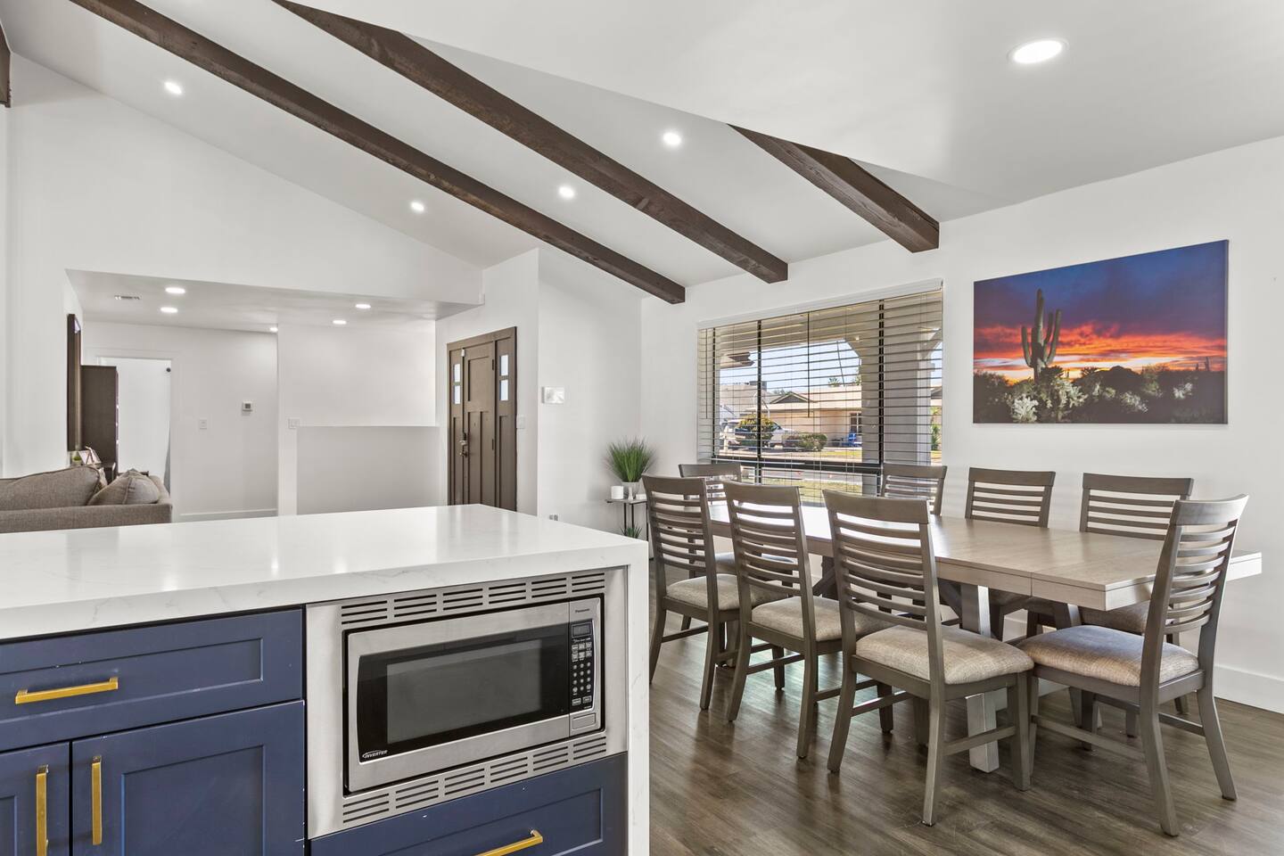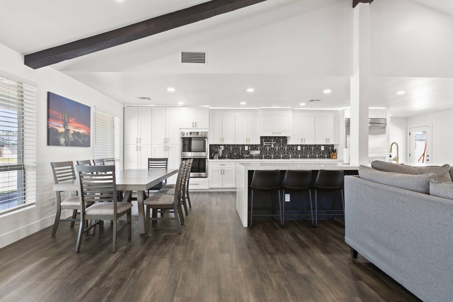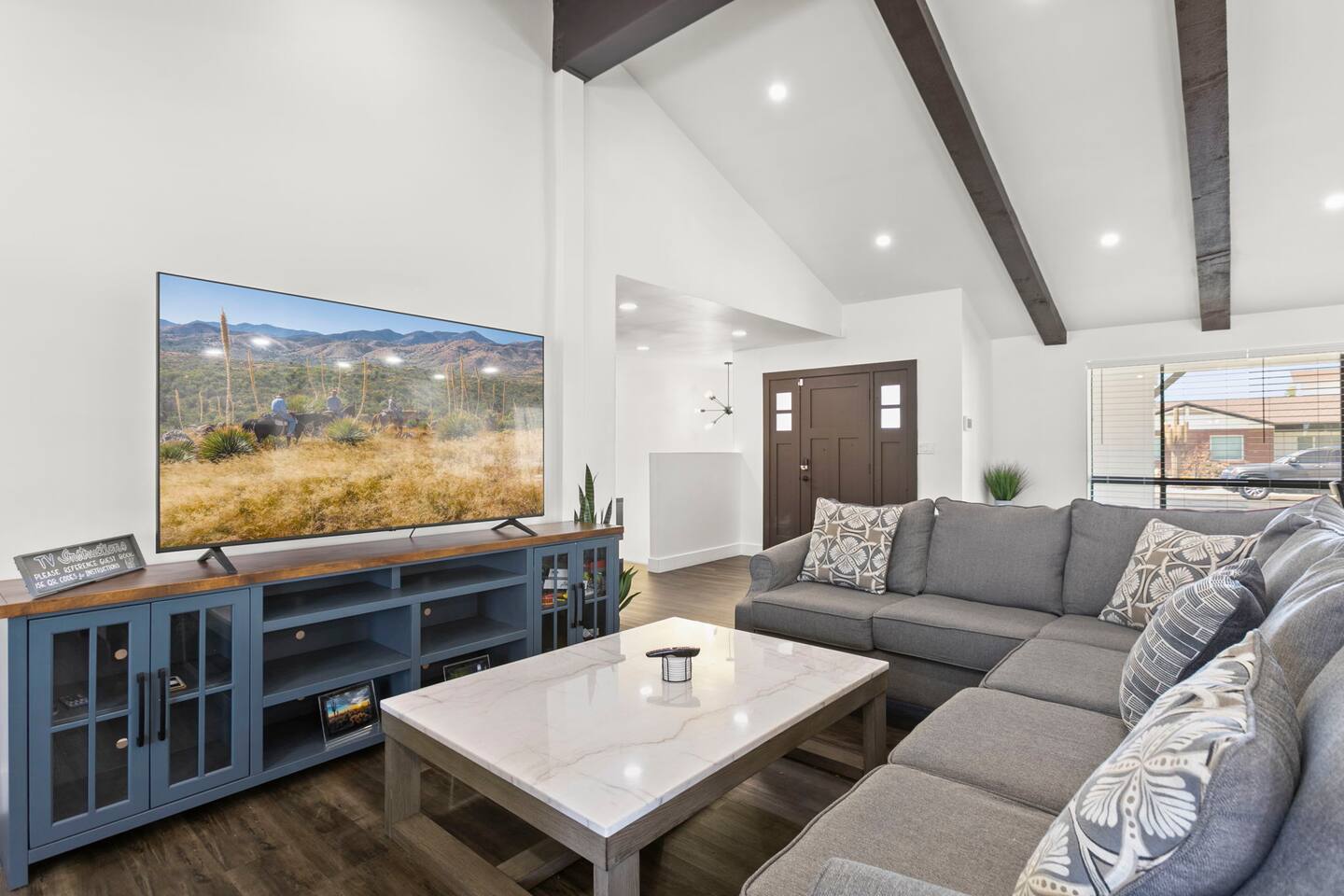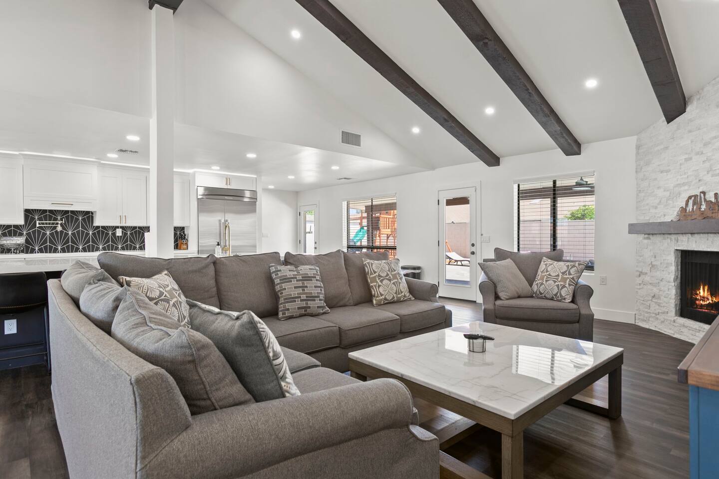 The Space Escape to Grove Oasis, which combines large square footage and custom design. Be prepared as this open-concept home will pull you right in. Upon entering the residence, you’ll notice the spacious floor plan welcoming you to make yourself right at home. Before sprinting to the pool, however, make sure to explore the spacious indoor living areas with beautiful bedrooms in which to kick back and relax away your travels. But don't rest too long - there's so much to do at this stylish home! Full Service Kitchen: Indulge in our modern full-service kitchen! With state-of-the-art appliances seamlessly integrated into the sleek, minimalist aesthetic, this culinary haven caters to every need. Whether you're a seasoned chef or an amateur cook, we welcome you to come spice up life! Living Room Area: Kick back and relax with the entire crew in the incredible living room space off the open concept kitchen and dining room. Large spacious L shaped sofa is the perfect space to stream your favorite shows on our 75" Smart TV while waiting for dinner with family and friends. Theatre/Bonus Room Area: Get ready for epic movie nights in our theater! We're talking an 86" screen that's basically life-sized, and a sound system that'll have you feeling every boom and whisper. So grab the popcorn, kick back, and let's turn movie nights into unforgettable adventures, right here at your home away from home. Bedrooms: Come sink into a cloud of comfort in our bedrooms! We use soft sheets and snuggly comforters that'll make you never want to leave. A King, Four Queens, and eight Bunk beds for the kiddos. Oh and a futon! Bring the gang and have maximum sleepover vibes. It's all about making your stay feel like a warm hug – cozy and totally awesome. In total we have A king, three Queens, and 2 sets of bunk beds for the kiddos. Please note that Bedroom 1 has extra wide 36" doors for step-less outdoor entry, bathroom, and kitchen access. Direct access to a connected full bath that has a step-free door-less extra wide shower ramp and a heavy duty adjustable height plastic shower bench w/ backrest and shower handles. Bathrooms: Fresh and fabulous, our remodeled bathrooms are here to elevate your stay! Four full bathrooms so that sharing is limited! Fluffy towels, modern vibes – it's all set to make you feel pampered and right at home. Outdoor Space: Dive into the ultimate chill zone for our house guests! The pool's got it all - a slide that's all about fun, a spa that's pure relaxation, and a cool waterfall corner for those lazy vibes. It's all here, so grab your swimsuit and let's make some splashy memories. After a nice dip, the kids' playhouse is ready for adventure, while the BBQ grill is sizzling for your outdoor feast. Throw down with Corn hole or outdoor Jenga! Pool/Hot Tub: Please note that the pool and spa/hot tub heat cannot be turned on at the same time. These are automated and controlled on our end. If the pool heat is currently on and you'd like to switch to the hot tub, simply send us a message, and we’ll be happy to turn it on for you. We're committed to ensuring you have the best experience possible, so don't hesitate to reach out if you have any questions! Other things to note Entertainment is available at the property: *86" TV Theatre room with sound system *Pool w/ waterslide/fountains/waterfall, Spa *Play-set, outdoor toys *Games, board/card games. Parking Instructions: 2 cars in driveway, 2 cars on street by the house. Nestled in Mesa, you’ll have easy access to the finest dining, entertainment, and major freeways to travel the Phoenix valley as you please. Following are a list of close by attractions: Emerald Park: A 3 minute walk will land you at Emerald Park. Over 16 acres of green grass with lots of fun options including: Disk Golf , Basketball Courts, Picnic Tables/Grills, a Playground, and more! Look for our disk golf set in the outdoor toys. Mother Nature's Farm: Just a 3 minute drive down the road is Mother Nature's Farm. Special seasonal activities can be found here! Pumpkin patches, a hay bale maze, a cozy farm boutique, and an animal petting area make this a great memory and photoshoot! Local Golf: Hit up the many nearby golf courses that are just a few miles away! Downtown Gilbert:Make sure to visit the lively nightlife of Gilbert. Just an 8 minute drive south, the town offers many pubs and restaurants. Just take Gilbert Rd south. You can't miss it! Mesa Arts Center:Ten minutes Northwest will take you to the Mesa Arts Center. Make sure to check the many events, concerts, and exhibitions! A local favorite. Golfland Sunsplash Waterpark:Cool off with the family favorite waterpark! Just 8 minutes west and you'll be slippin' and slidin'! Mini golf is also available for a quick match! There are many stores nearby to stock up with. All within a 5 minute drive or less so that you spend less time shopping and more time relaxing! Bedroom 1 has extra wide 36" doors for step-less outdoor entry, bathroom, and kitchen access. Direct access to a connected full bath that has a step-free door-less extra wide shower ramp and a heavy duty adjustable height plastic shower bench w/ backrest and shower handles. TPT License #21525826 Mesa City License #LIC23-08035