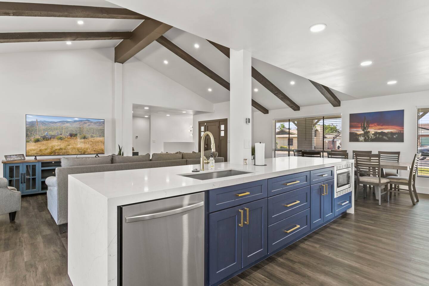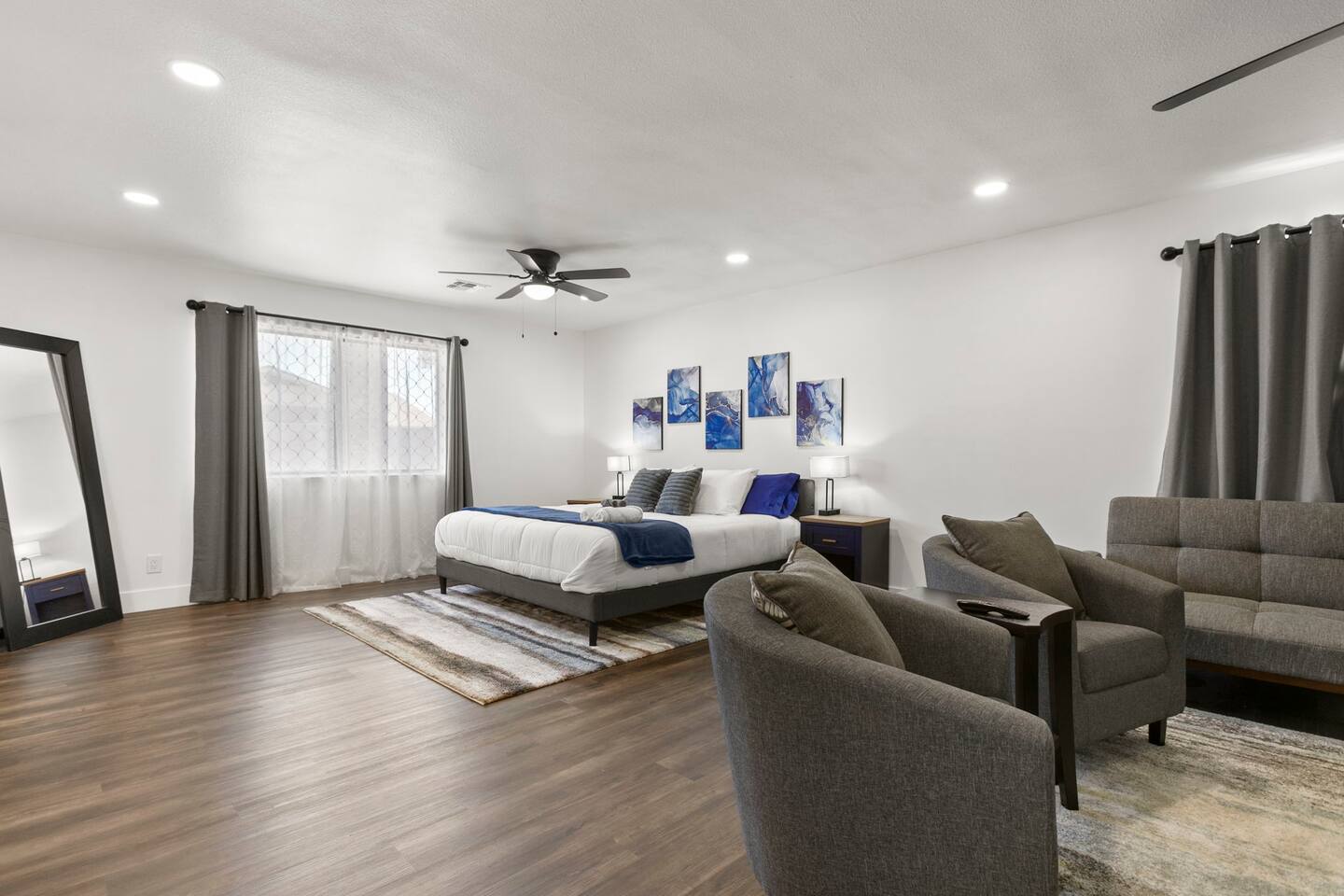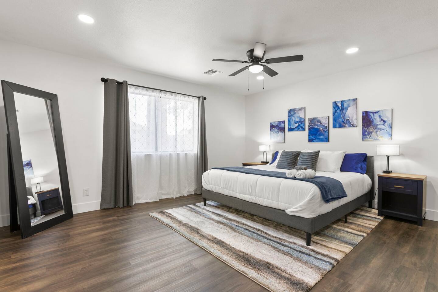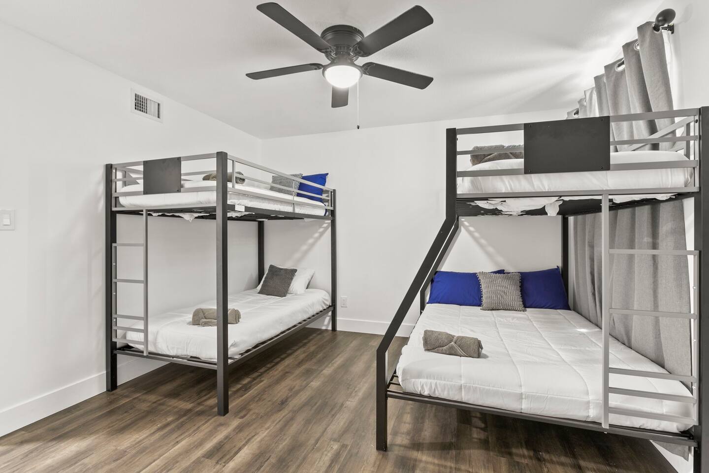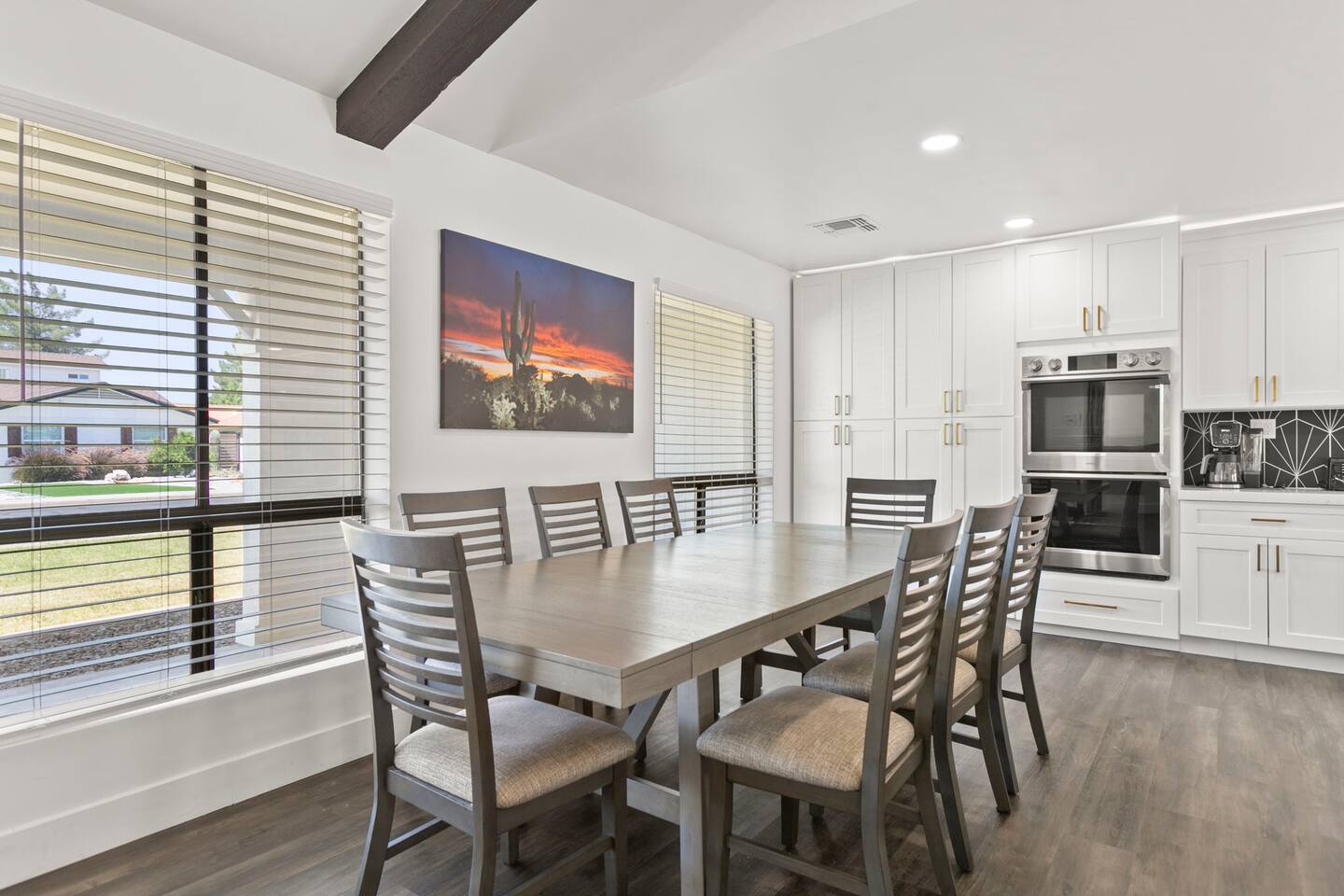 The Space Escape to Grove Oasis, which combines large square footage and custom design. Be prepared as this open-concept home will pull you right in. Upon entering the residence, you’ll notice the spacious floor plan welcoming you to make yourself right at home. Before sprinting to the pool, however, make sure to explore the spacious indoor living areas with beautiful bedrooms in which to kick back and relax away your travels. But don't rest too long - there's so much to do at this stylish home! Full Service Kitchen: Indulge in our modern full-service kitchen! With state-of-the-art appliances seamlessly integrated into the sleek, minimalist aesthetic, this culinary haven caters to every need. Whether you're a seasoned chef or an amateur cook, we welcome you to come spice up life! Living Room Area: Kick back and relax with the entire crew in the incredible living room space off the open concept kitchen and dining room. Large spacious L shaped sofa is the perfect space to stream your favorite shows on our 75" Smart TV while waiting for dinner with family and friends. Theatre/Bonus Room Area: Get ready for epic movie nights in our theater! We're talking an 86" screen that's basically life-sized, and a sound system that'll have you feeling every boom and whisper. So grab the popcorn, kick back, and let's turn movie nights into unforgettable adventures, right here at your home away from home. Bedrooms: Come sink into a cloud of comfort in our bedrooms! We use soft sheets and snuggly comforters that'll make you never want to leave. A King, Four Queens, and eight Bunk beds for the kiddos. Oh and a futon! Bring the gang and have maximum sleepover vibes. It's all about making your stay feel like a warm hug – cozy and totally awesome. In total we have A king, three Queens, and 2 sets of bunk beds for the kiddos. Please note that Bedroom 1 has extra wide 36" doors for step-less outdoor entry, bathroom, and kitchen access. Direct access to a connected full bath that has a step-free door-less extra wide shower ramp and a heavy duty adjustable height plastic shower bench w/ backrest and shower handles. Bathrooms: Fresh and fabulous, our remodeled bathrooms are here to elevate your stay! Four full bathrooms so that sharing is limited! Fluffy towels, modern vibes – it's all set to make you feel pampered and right at home. Outdoor Space: Dive into the ultimate chill zone for our house guests! The pool's got it all - a slide that's all about fun, a spa that's pure relaxation, and a cool waterfall corner for those lazy vibes. It's all here, so grab your swimsuit and let's make some splashy memories. After a nice dip, the kids' playhouse is ready for adventure, while the BBQ grill is sizzling for your outdoor feast. Throw down with Corn hole or outdoor Jenga! Pool/Hot Tub: Please note that the pool and spa/hot tub heat cannot be turned on at the same time. These are automated and controlled on our end. If the pool heat is currently on and you'd like to switch to the hot tub, simply send us a message, and we’ll be happy to turn it on for you. We're committed to ensuring you have the best experience possible, so don't hesitate to reach out if you have any questions! Other things to note Entertainment is available at the property: *86" TV Theatre room with sound system *Pool w/ waterslide/fountains/waterfall, Spa *Play-set, outdoor toys *Games, board/card games. Parking Instructions: 2 cars in driveway, 2 cars on street by the house. Nestled in Mesa, you’ll have easy access to the finest dining, entertainment, and major freeways to travel the Phoenix valley as you please. Following are a list of close by attractions: Emerald Park: A 3 minute walk will land you at Emerald Park. Over 16 acres of green grass with lots of fun options including: Disk Golf , Basketball Courts, Picnic Tables/Grills, a Playground, and more! Look for our disk golf set in the outdoor toys. Mother Nature's Farm: Just a 3 minute drive down the road is Mother Nature's Farm. Special seasonal activities can be found here! Pumpkin patches, a hay bale maze, a cozy farm boutique, and an animal petting area make this a great memory and photoshoot! Local Golf: Hit up the many nearby golf courses that are just a few miles away! Downtown Gilbert:Make sure to visit the lively nightlife of Gilbert. Just an 8 minute drive south, the town offers many pubs and restaurants. Just take Gilbert Rd south. You can't miss it! Mesa Arts Center:Ten minutes Northwest will take you to the Mesa Arts Center. Make sure to check the many events, concerts, and exhibitions! A local favorite. Golfland Sunsplash Waterpark:Cool off with the family favorite waterpark! Just 8 minutes west and you'll be slippin' and slidin'! Mini golf is also available for a quick match! There are many stores nearby to stock up with. All within a 5 minute drive or less so that you spend less time shopping and more time relaxing! Bedroom 1 has extra wide 36" doors for step-less outdoor entry, bathroom, and kitchen access. Direct access to a connected full bath that has a step-free door-less extra wide shower ramp and a heavy duty adjustable height plastic shower bench w/ backrest and shower handles. TPT License #21525826 Mesa City License #LIC23-08035