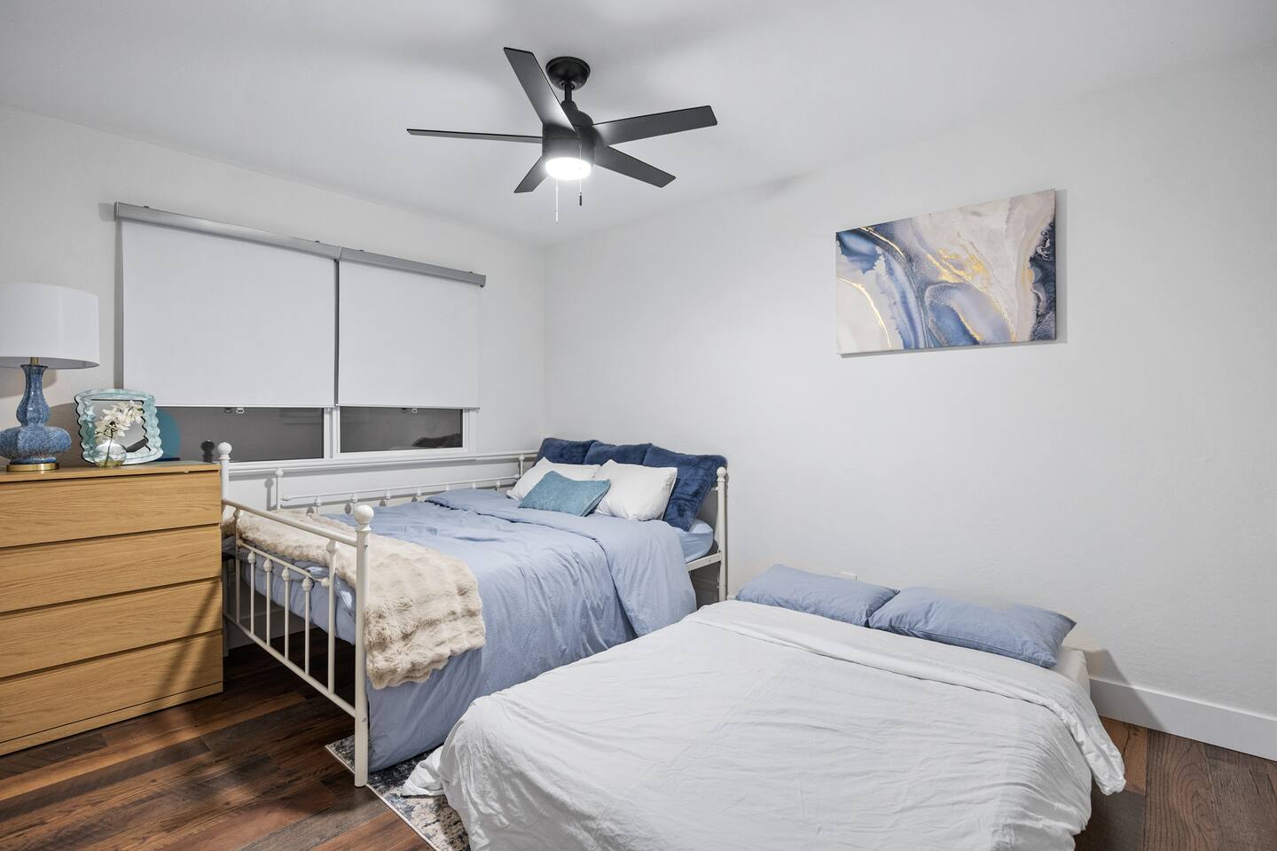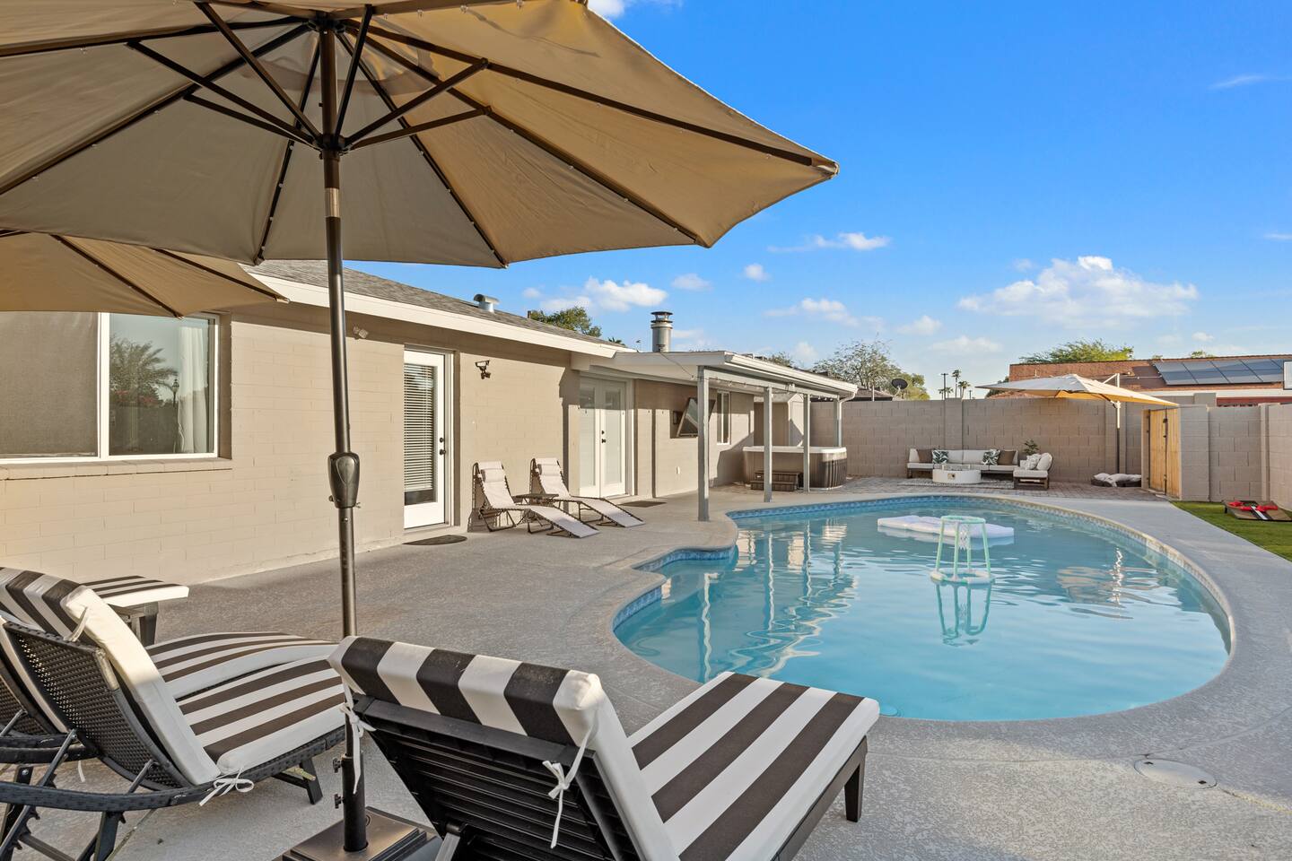 This spacious 1,988 sqft home features 5 beds, 2 baths and all the amenities you need for a relaxing and enjoyable stay. Highlights: ✅ A very large living room with wooden floors, perfect for lounging or playing board games ✅ A fully equipped kitchen with stainless steel appliances, cookware, utensils, and even a Nespresso machine for your morning fix ✅ A dining table that seats 8, ideal for shared meals or game nights ✅ A very large pool and a hot tub that can fit 4-6 people What You'll Love: ✅ Outdoor TV, fire pit and games like CornHole, Pool Pong, Pool Basketball, and a variety of floats including a large unicorn (air pump in the shed) ✅ Scudder Park has a playground, great for kids and families ✅ The Lakes is less than a 10 min walk away! Great for a picnic or evening walk with lake views. ✅ All you can eat KBBQ/Sushi (Central BBQ Lakeshore) and Pier 54 is also less than 10 min walk away! Bedroom Arrangement: ✅ Master bedroom: with an ensuite bathroom stocked with all essentials ✅ Brown Room: Queen bed + dedicated work desk ✅ Green Room: Queen bed ✅ Blue Room: Queen bed + Pull-out Full Bed (Bedding and Pillows in the room’s closet) Booking Details: ✅ Check-in and Check-out: 4:00 PM and 10:00 AM, respectively. Guests are expected to adhere to these designated times. Detailed instructions will be provided closer to the arrival date. ✅ No. of Guests: Maximum of 8 guests. Only registered guests are allowed on the property. ✅ No Deposit Required. ✅ Housekeeping: The cleaning fee covers standard cleaning between reservations only. There is no daily housekeeping. If you’d like a mid-stay cleaning, we can connect you with our cleaning team at your expense. 🛒 Grocery Stores Nearby: • Trader Joe's - 4 min (0.9 mi) • Fry's Food and Drug 4 min. (1 mi) • Safeway - 10 min. (3.1 mi) 📍 Best Attractions Nearby: • 15 mins from Scottsdale and Chandler • 20 mins from DT Phoenix and Gilbert • Phoenix Sky Harbor International Airport - 13 min (8.6 mi) • SEA LIFE Arizona Aquarium - 10 min (3.9 mi) • Tempe Marketplace - 12 mins (7.1 mi) • ASU Gammage – 13 mins (4.3 mi) • Tempe Town Lake – 14 mins (9.1 mi) • Sun Devil Stadium – 17 mins (4.5 mi) • Papago Park – 15 mins (9.7 mi) • Phoenix Zoo – 17 mins (9.8 mi) • Desert Botanical Garden – 18 mins (10.3 mi) • Mill Avenue District – 19 mins (5.6 mi) • Tempe Center for the Arts – 16 mins (8.6 mi) • Arizona Mills – 9 mins (3.3 mi) Pool and Hot Tub Disclaimer: By booking this property, guests acknowledge that the pool and hot tub are NOT supervised. The owners are not liable for any injuries or incidents related to pool use. Children must be supervised at all times. Our Team: This home is proudly hosted by Stay Klassi Properties, a trusted vacation rental management company committed to exceptional hospitality and seamless stays. We are dedicated to providing you with a personal, immersive, and authentic experience—ensuring comfort, convenience, and unforgettable memories. Let us make your getaway truly exceptional!