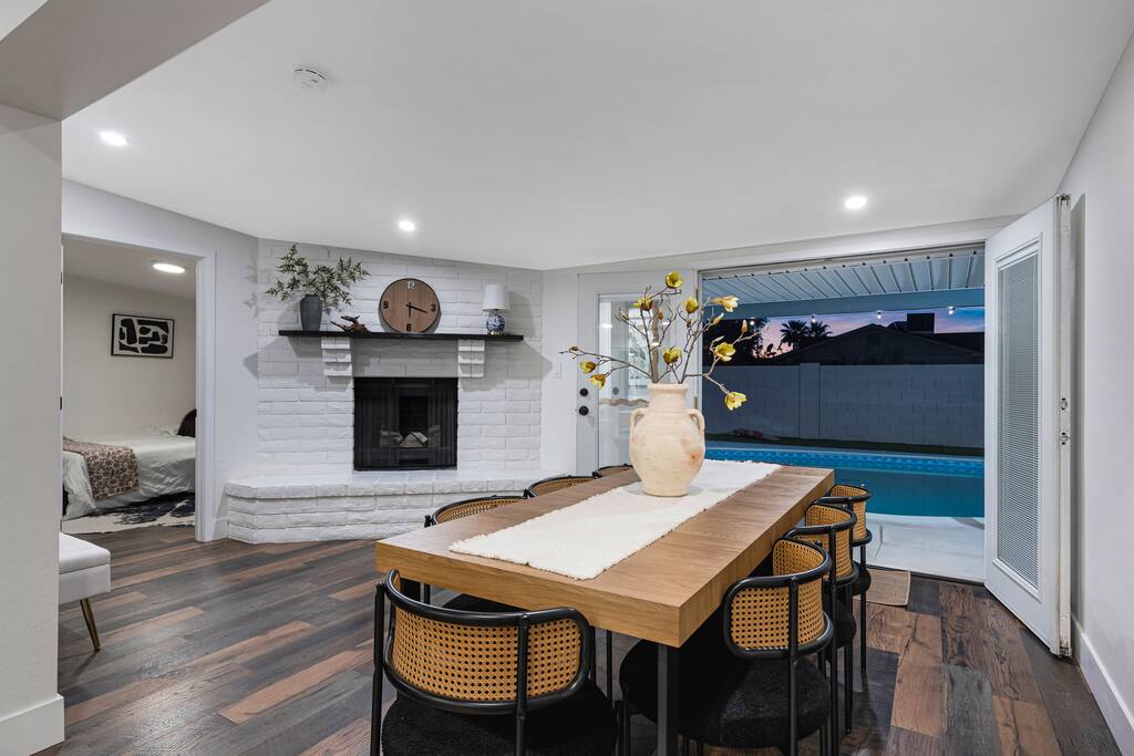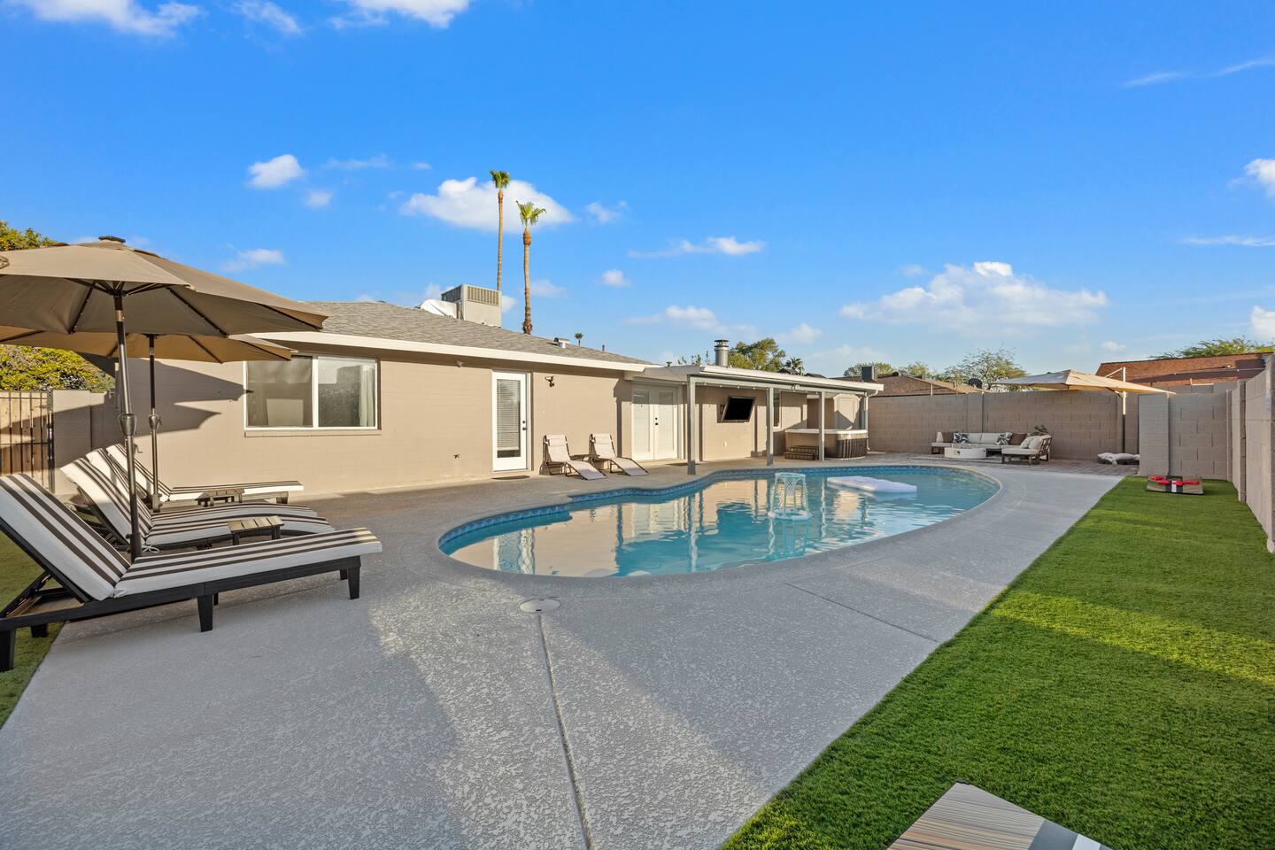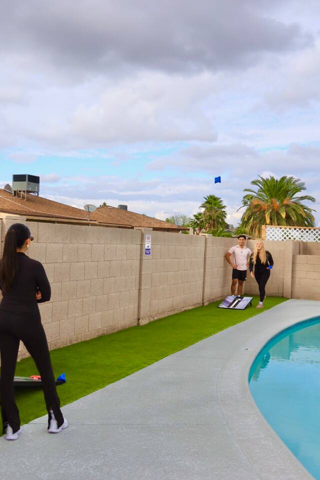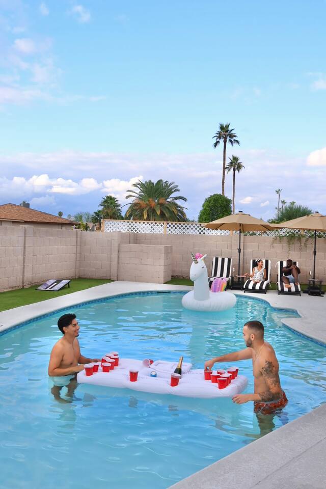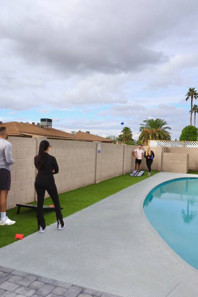 Your Tempe Escape Awaits! Relax in this spacious 4BR, 2BA Tempe retreat, perfect for families or friends! Enjoy a private pool and hot tub, catch a game on the outdoor TV, or unwind by the fire pit under the stars. The open-concept layout is ideal for group hangouts, with games like Cornhole, Pool Pong, and Scrabble to keep everyone entertained. The fully equipped kitchen, with a Nespresso machine, makes it easy to feel at home. A park, playground, and lake are just a quick 10-minute walk away!