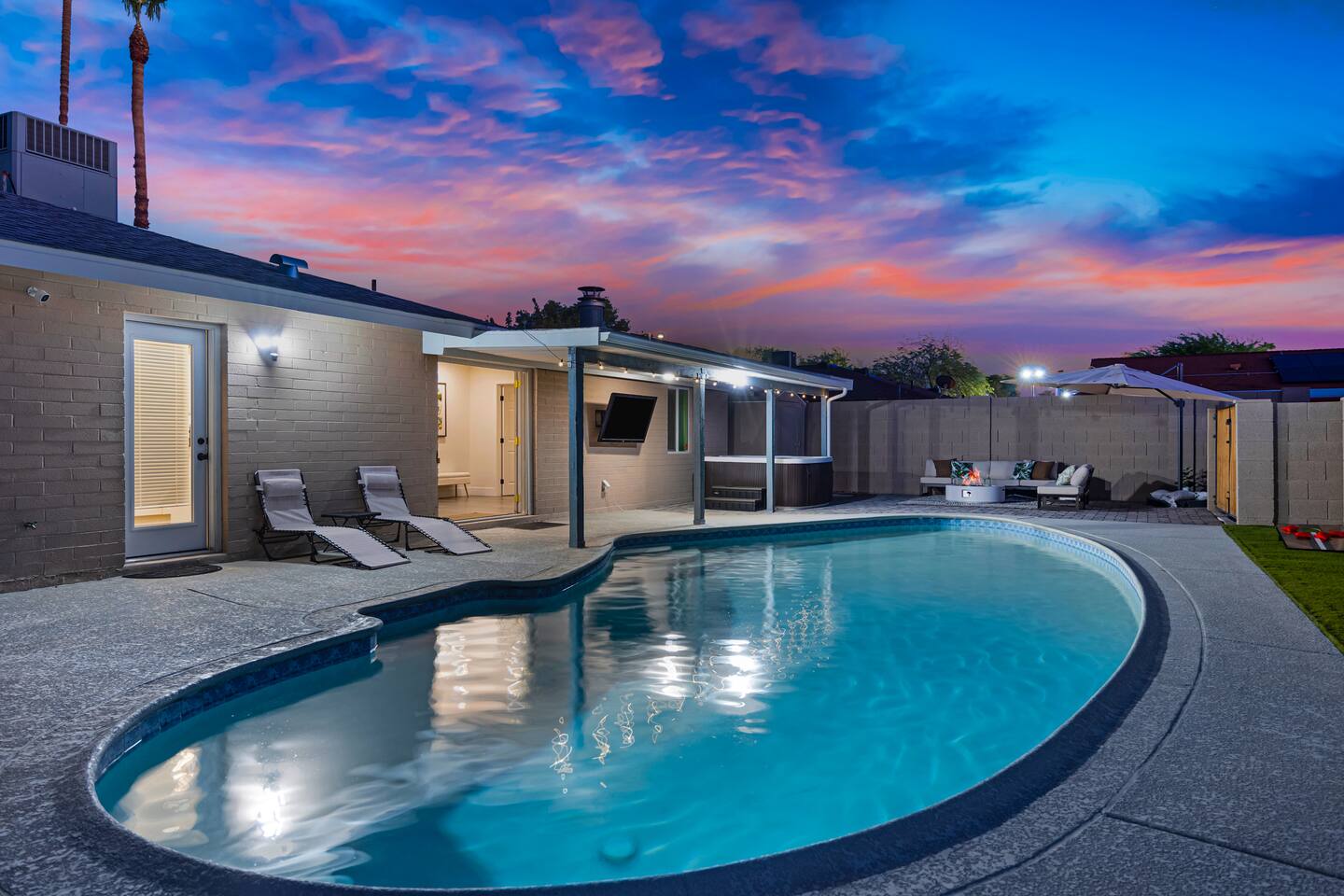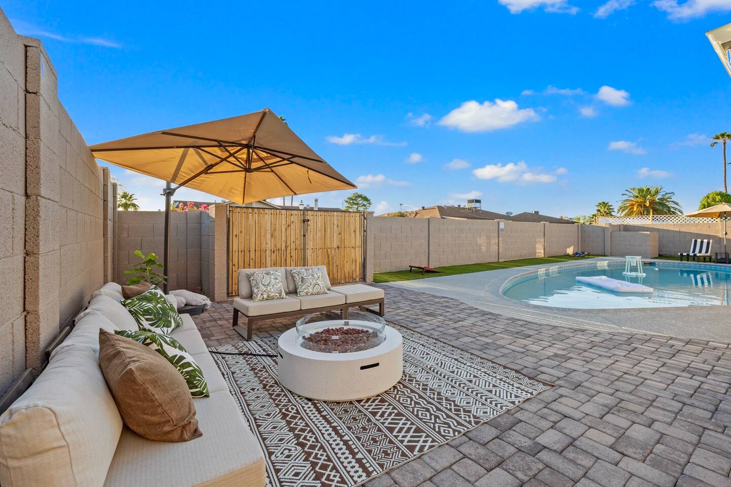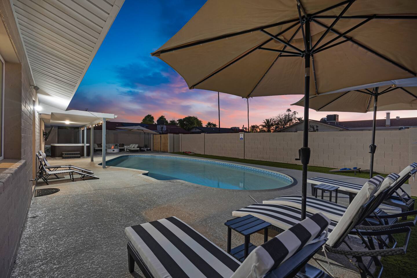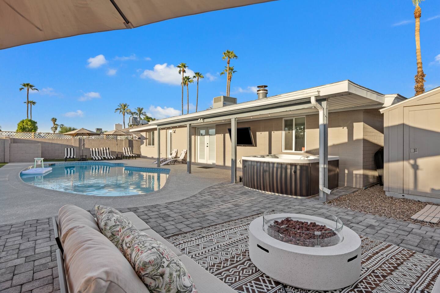 Your Tempe Escape Awaits! Relax in this spacious 4BR, 2BA Tempe retreat, perfect for families or friends! Enjoy a private pool and hot tub, catch a game on the outdoor TV, or unwind by the fire pit under the stars. The open-concept layout is ideal for group hangouts, with games like Cornhole, Pool Pong, and Scrabble to keep everyone entertained. The fully equipped kitchen, with a Nespresso machine, makes it easy to feel at home. A park, playground, and lake are just a quick 10-minute walk away!