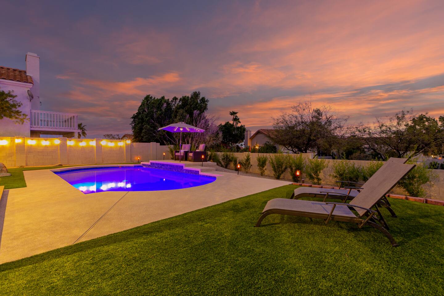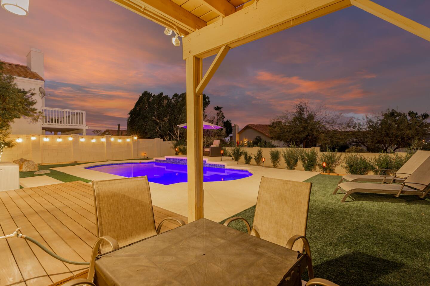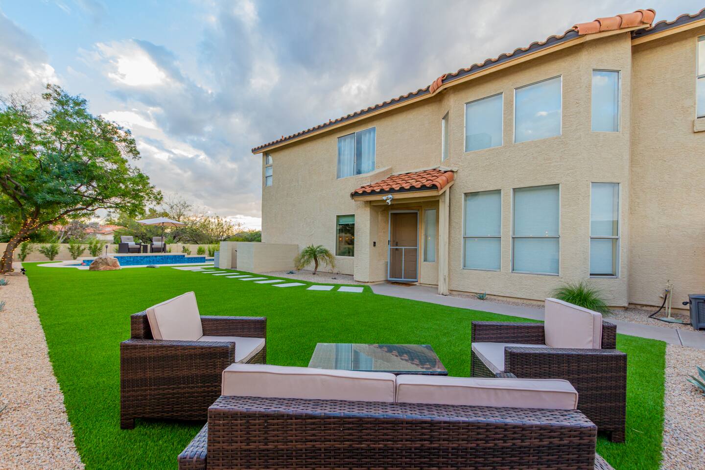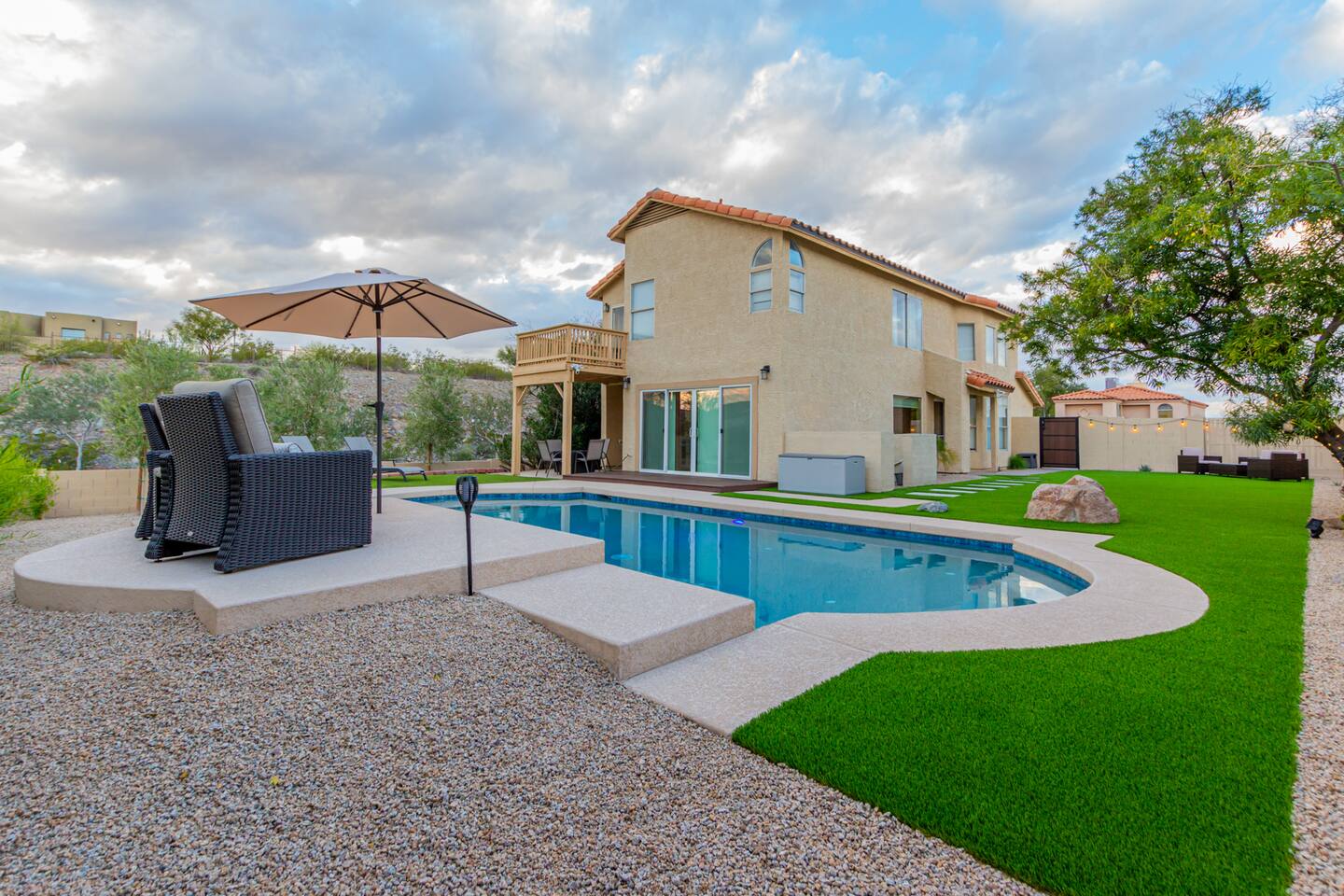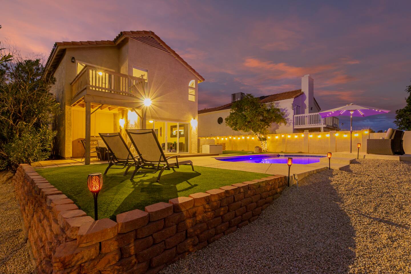 This is a spacious 2000 Sqft two story home w/ 4 beds, 1 sofa sleeper, and 2.5 baths. Home comes w/ two huge TVs. Living room TV is a smart TV so that you can log in to your personal Netflix, Hulu, etc. Sleeping areas: Master Bedroom - King bed Bedroom 2 - Kind bed Bedroom 3 - Bunk bed (2 Fulls) Bedroom 4 - Sofa Sleeper (Queen); accessed through the master bedroom Couch is big enough to sleep one as well Kitchen: Comes fully stocked w/ pots, pans, plates, bowls, glasses, mugs, cooking utensils, cutlery, and a full bar setup which includes wine glasses, champagne flutes, beer mugs, margarita glasses, whiskey glasses, and shot glasses. Also included is a mini fridge for your beverages. Regular refrigerator has filtered water and ice. Dining area: Large Dining room table set that seats 6 comfortably. 3 larger bar stools at the island for additional seating. Living area: Large sectional with room to hang out and watch tv (cable included) on the massive 86" big screen Smart TV. Plenty of card games included. House comes stocked with: - Corn Hole Set - Ladder Ball - Connect4 - Giant Jenga - Cards - Card games - Log in access to streaming services Laundry room area: - Full washer & dryer Outside area: - Artificial turf - Grill - Gas fire pit w/ 4 chairs - Lounge chairs - Outdoor sectional Outdoor string lighting - Solar lava lights - Plenty of insta-worthy backdrops - Pool (pool lights) - Heated Pool ($75 per day; 2 days minimum) to cover the cost of utilities. Please request 72 hours prior to booking. We will send a separate payment for this through the Airbnb app. In the summer months of July, August, and September, the air temperature is typically warm enough to keep the pool at a nice temperature without paying for the pool heat. -- House is well equipped with: - Towels - Pool towels - Toilet paper - Paper towels - Shampoo - Conditioner - Body wash - Soap - Laundry Detergent - Trash bags - Dishwasher soap Phoenix Operating Permit #STR-2024-002869