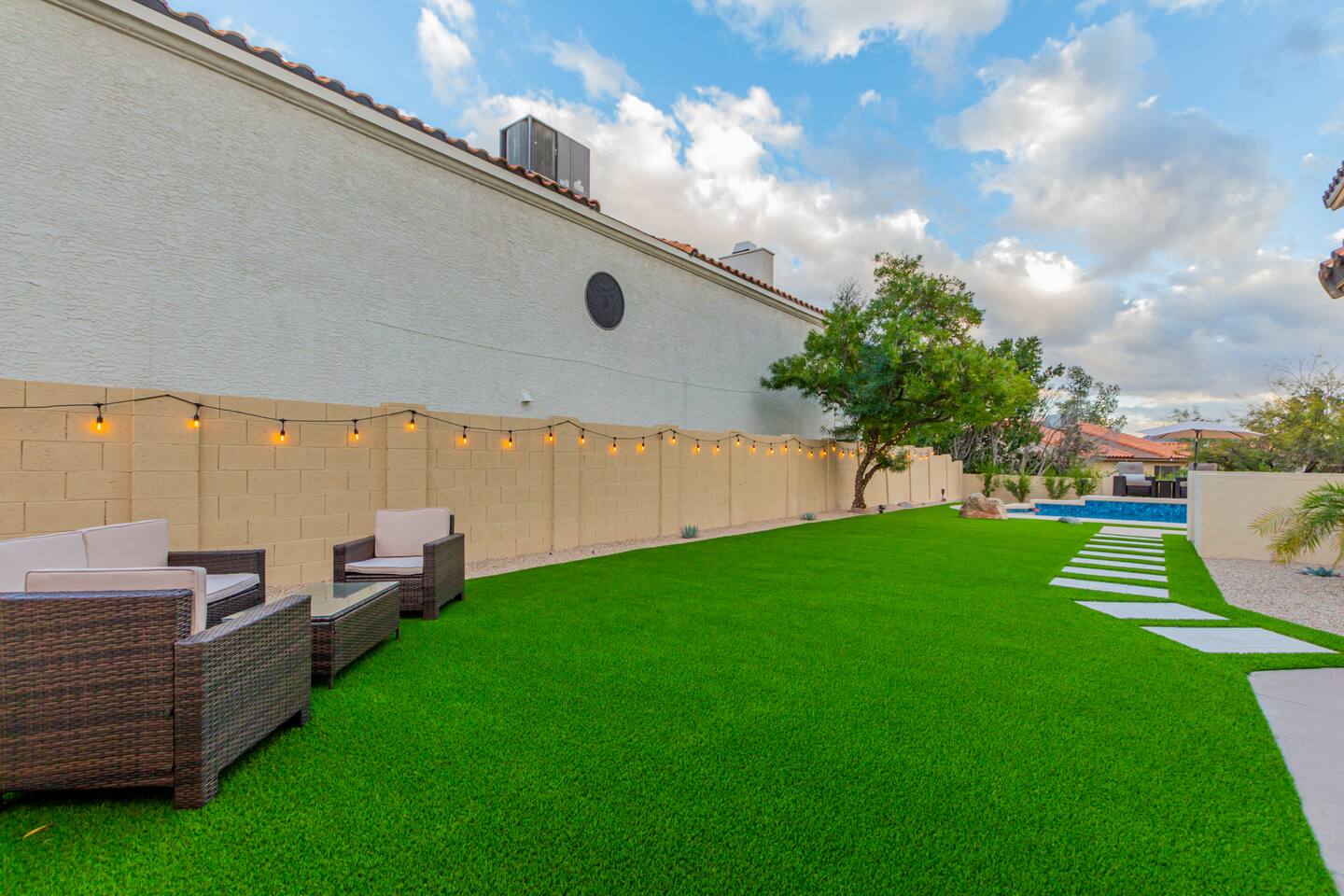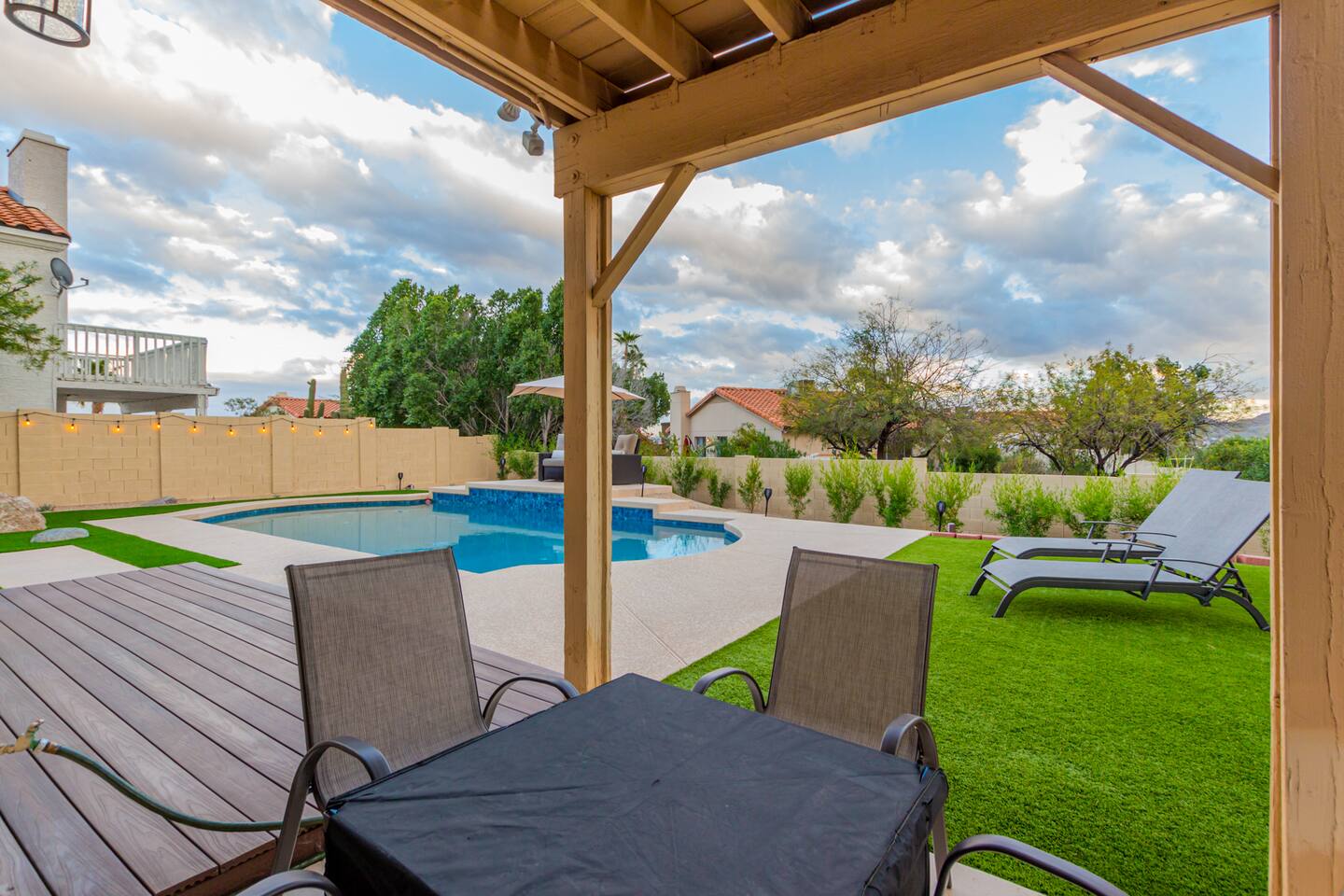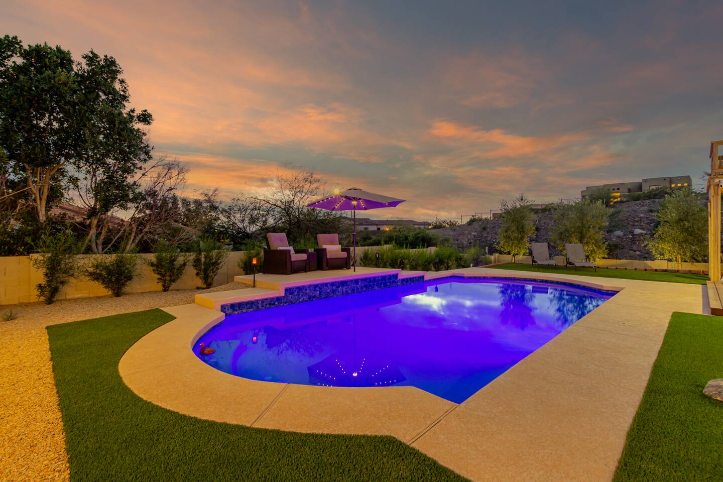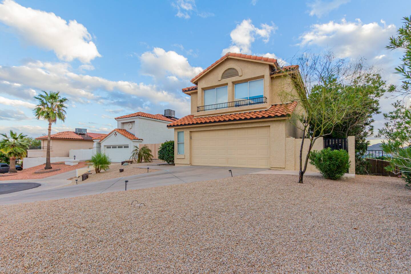 This is a spacious 2000 Sqft two story home w/ 4 beds, 1 sofa sleeper, and 2.5 baths. Home comes w/ two huge TVs. Living room TV is a smart TV so that you can log in to your personal Netflix, Hulu, etc. Sleeping areas: Master Bedroom - King bed Bedroom 2 - Kind bed Bedroom 3 - Bunk bed (2 Fulls) Bedroom 4 - Sofa Sleeper (Queen); accessed through the master bedroom Couch is big enough to sleep one as well Kitchen: Comes fully stocked w/ pots, pans, plates, bowls, glasses, mugs, cooking utensils, cutlery, and a full bar setup which includes wine glasses, champagne flutes, beer mugs, margarita glasses, whiskey glasses, and shot glasses. Also included is a mini fridge for your beverages. Regular refrigerator has filtered water and ice. Dining area: Large Dining room table set that seats 6 comfortably. 3 larger bar stools at the island for additional seating. Living area: Large sectional with room to hang out and watch tv (cable included) on the massive 86" big screen Smart TV. Plenty of card games included. House comes stocked with: - Corn Hole Set - Ladder Ball - Connect4 - Giant Jenga - Cards - Card games - Log in access to streaming services Laundry room area: - Full washer & dryer Outside area: - Artificial turf - Grill - Gas fire pit w/ 4 chairs - Lounge chairs - Outdoor sectional Outdoor string lighting - Solar lava lights - Plenty of insta-worthy backdrops - Pool (pool lights) - Heated Pool ($75 per day; 2 days minimum) to cover the cost of utilities. Please request 72 hours prior to booking. We will send a separate payment for this through the Airbnb app. In the summer months of July, August, and September, the air temperature is typically warm enough to keep the pool at a nice temperature without paying for the pool heat. -- House is well equipped with: - Towels - Pool towels - Toilet paper - Paper towels - Shampoo - Conditioner - Body wash - Soap - Laundry Detergent - Trash bags - Dishwasher soap Phoenix Operating Permit #STR-2024-002869
