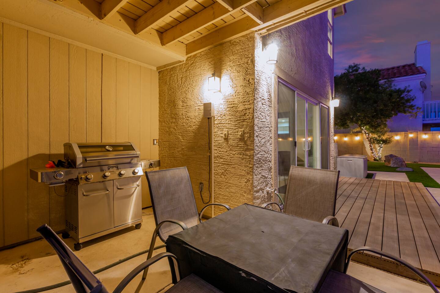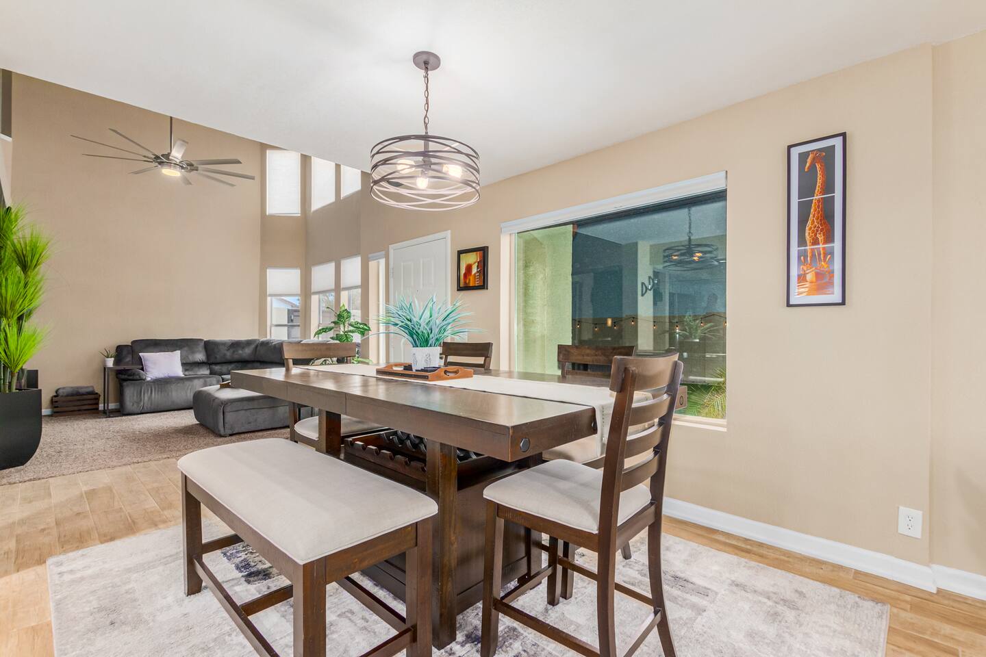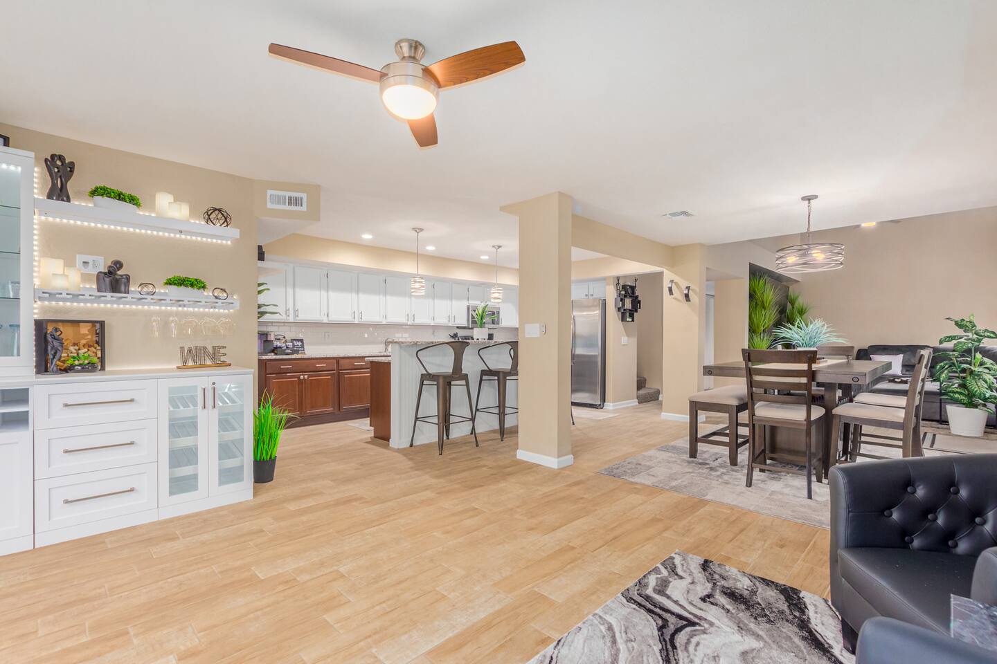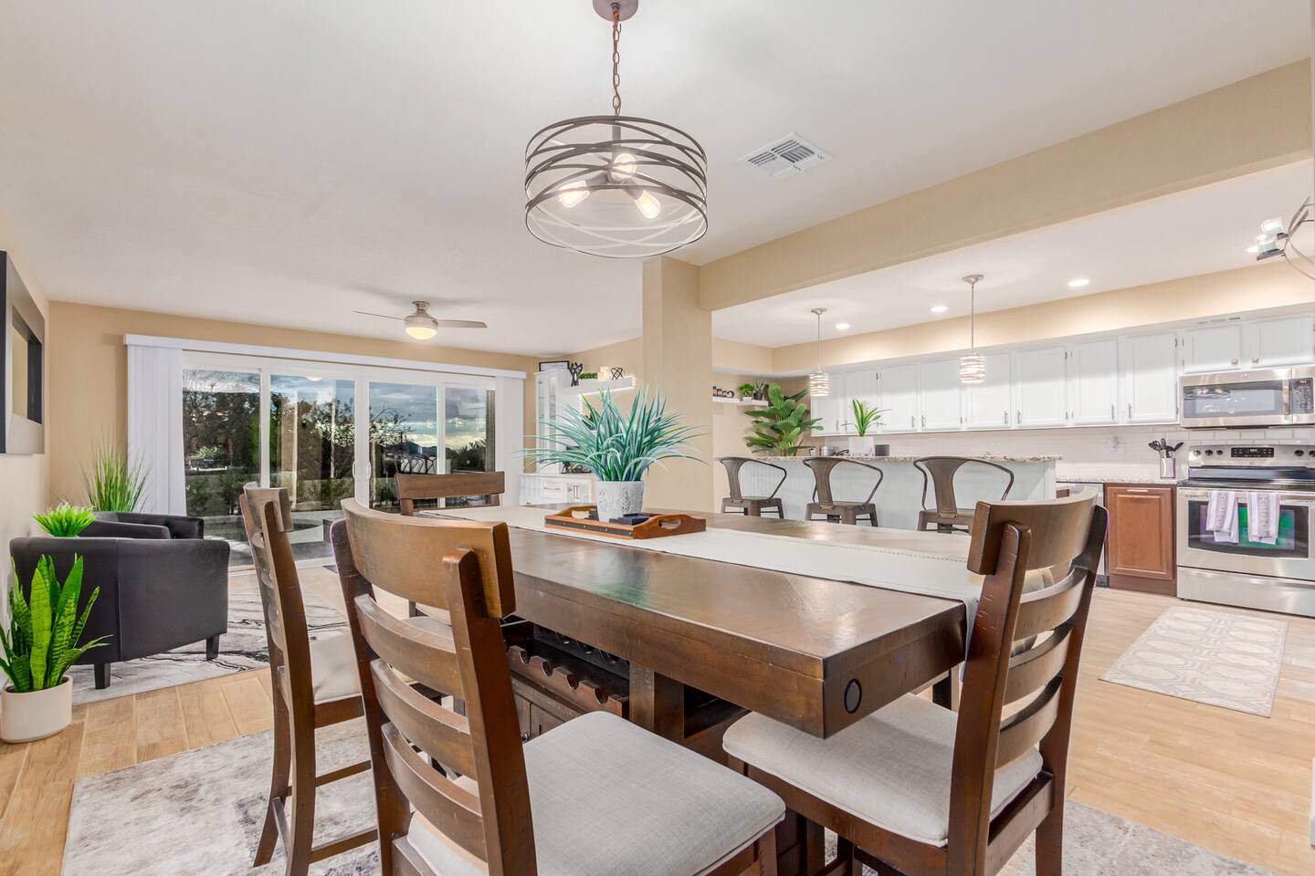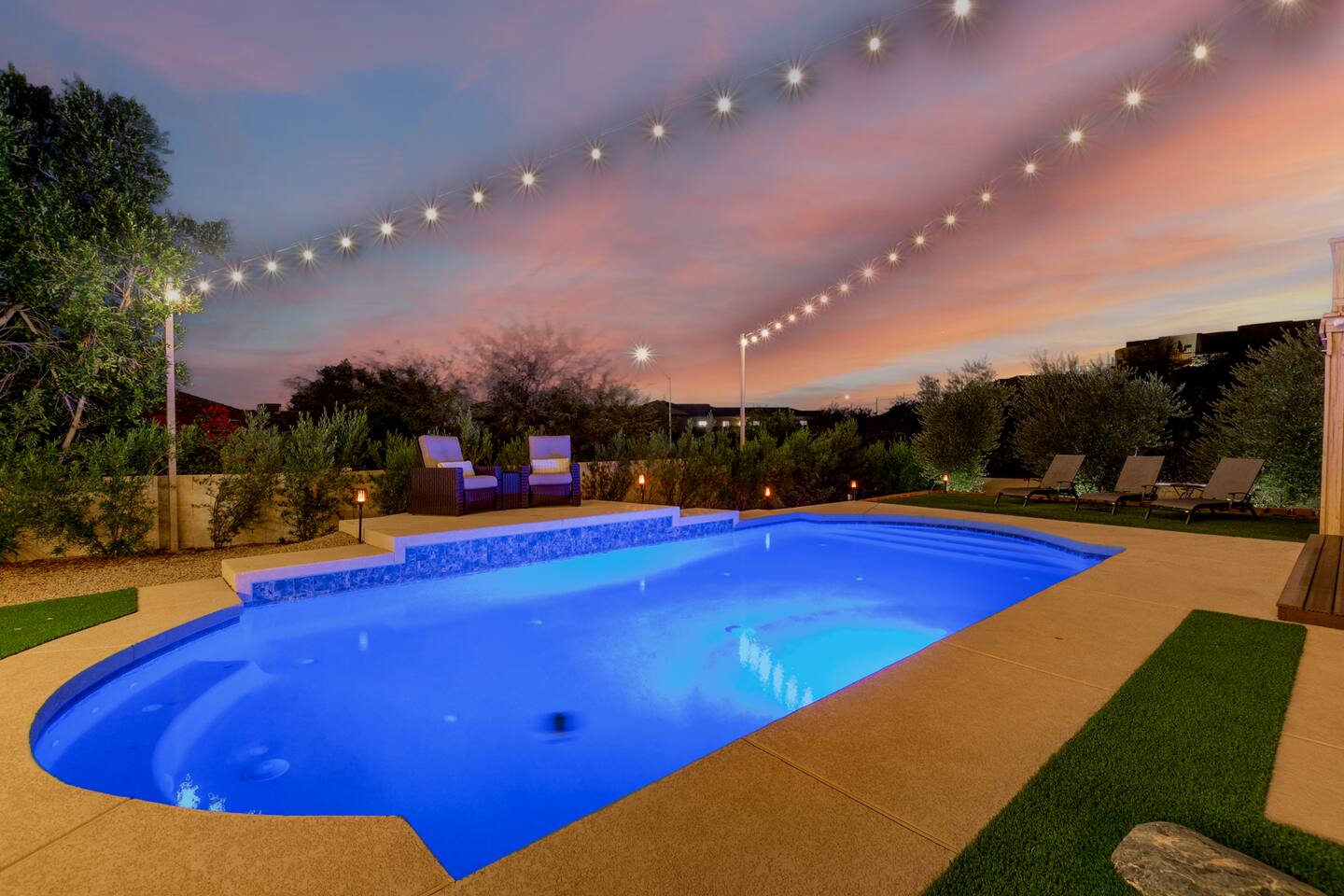 This is a spacious 2000 Sqft two story home w/ 4 beds, 1 sofa sleeper, and 2.5 baths. Home comes w/ two huge TVs. Living room TV is a smart TV so that you can log in to your personal Netflix, Hulu, etc. Sleeping areas: Master Bedroom - King bed Bedroom 2 - Kind bed Bedroom 3 - Bunk bed (2 Fulls) Bedroom 4 - Sofa Sleeper (Queen); accessed through the master bedroom Couch is big enough to sleep one as well Kitchen: Comes fully stocked w/ pots, pans, plates, bowls, glasses, mugs, cooking utensils, cutlery, and a full bar setup which includes wine glasses, champagne flutes, beer mugs, margarita glasses, whiskey glasses, and shot glasses. Also included is a mini fridge for your beverages. Regular refrigerator has filtered water and ice. Dining area: Large Dining room table set that seats 6 comfortably. 3 larger bar stools at the island for additional seating. Living area: Large sectional with room to hang out and watch tv (cable included) on the massive 86" big screen Smart TV. Plenty of card games included. House comes stocked with: - Corn Hole Set - Ladder Ball - Connect4 - Giant Jenga - Cards - Card games - Log in access to streaming services Laundry room area: - Full washer & dryer Outside area: - Artificial turf - Grill - Gas fire pit w/ 4 chairs - Lounge chairs - Outdoor sectional Outdoor string lighting - Solar lava lights - Plenty of insta-worthy backdrops - Pool (pool lights) - Heated Pool ($75 per day; 2 days minimum) to cover the cost of utilities. Please request 72 hours prior to booking. We will send a separate payment for this through the Airbnb app. In the summer months of July, August, and September, the air temperature is typically warm enough to keep the pool at a nice temperature without paying for the pool heat. -- House is well equipped with: - Towels - Pool towels - Toilet paper - Paper towels - Shampoo - Conditioner - Body wash - Soap - Laundry Detergent - Trash bags - Dishwasher soap Phoenix Operating Permit #STR-2024-002869