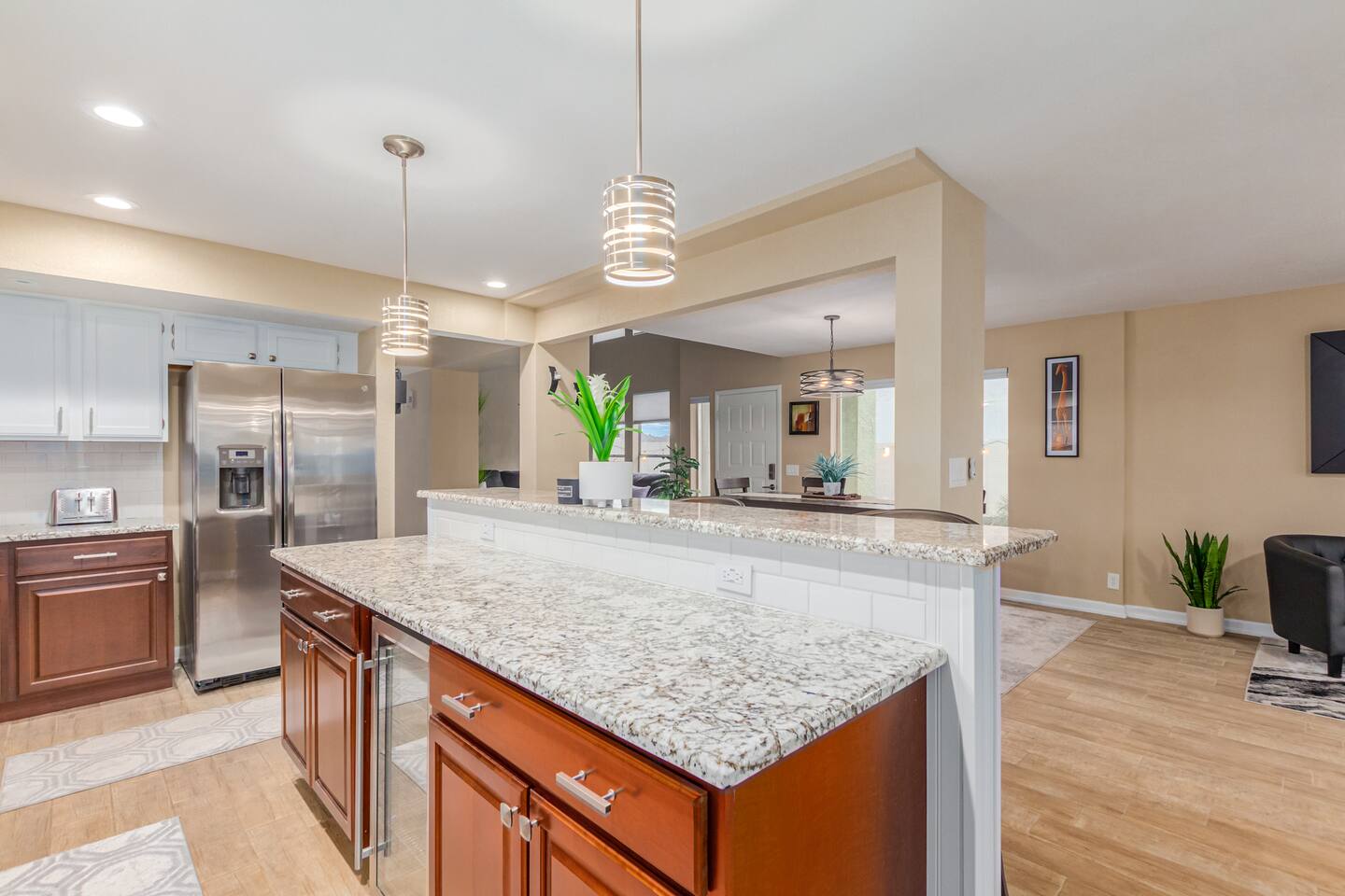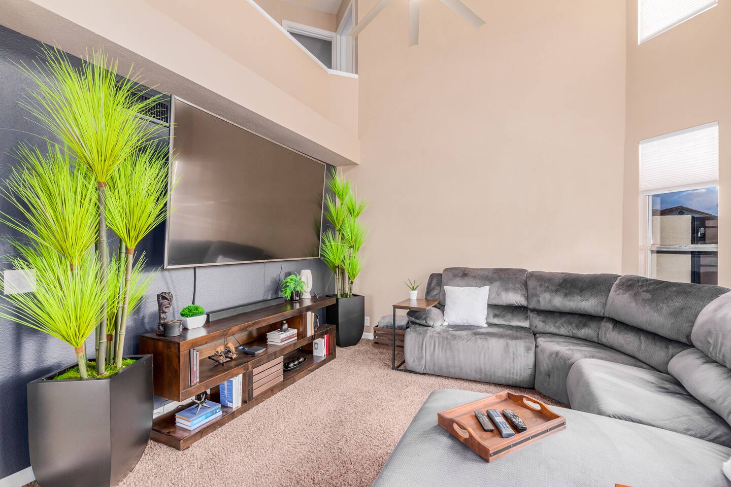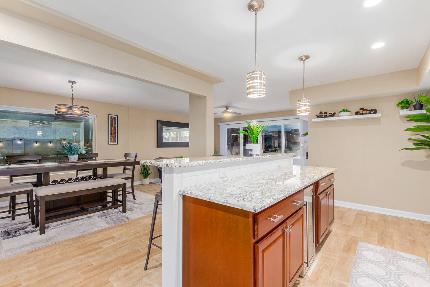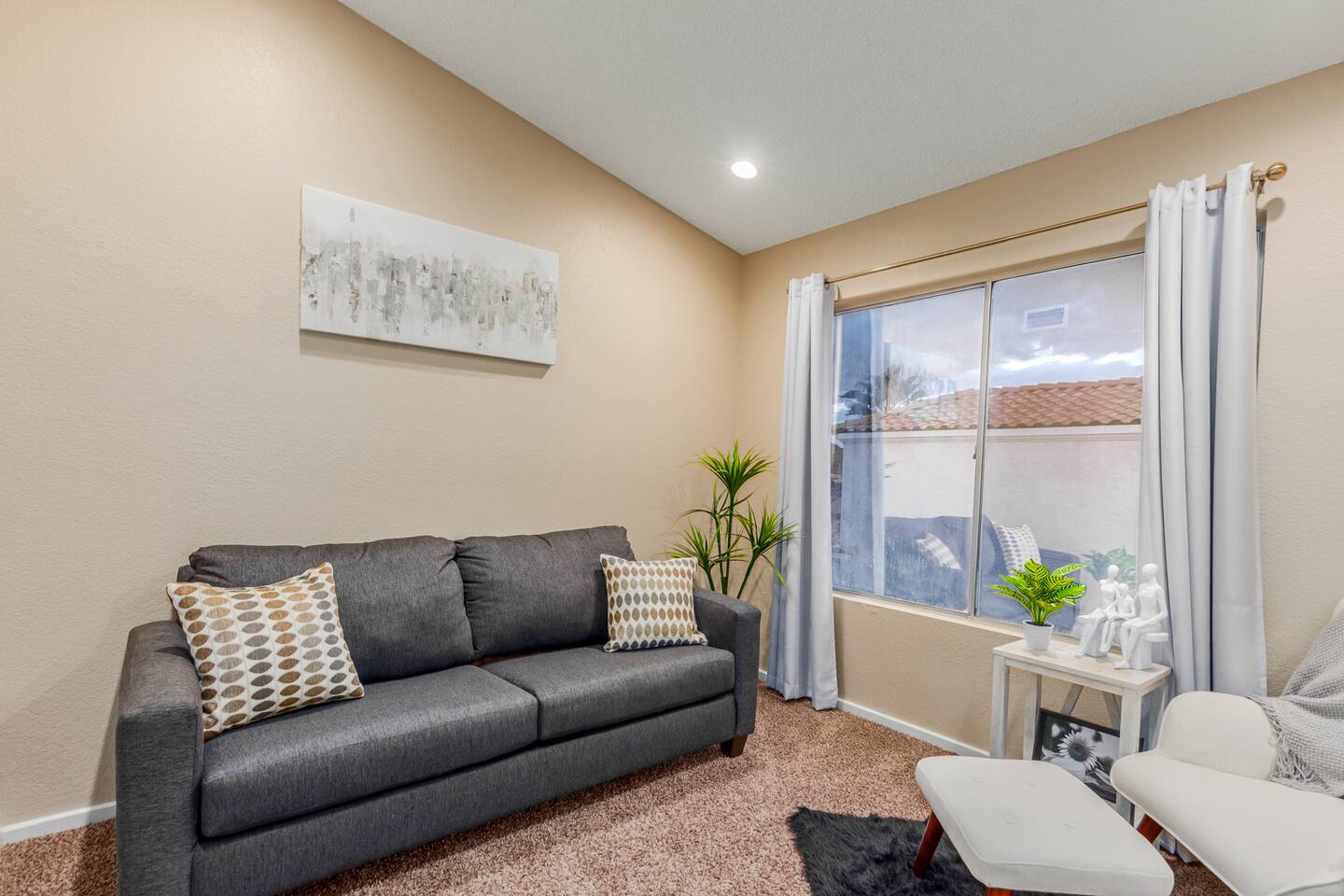 This is a spacious 2000 Sqft two story home w/ 4 beds, 1 sofa sleeper, and 2.5 baths. Home comes w/ two huge TVs. Living room TV is a smart TV so that you can log in to your personal Netflix, Hulu, etc. Sleeping areas: Master Bedroom - King bed Bedroom 2 - Kind bed Bedroom 3 - Bunk bed (2 Fulls) Bedroom 4 - Sofa Sleeper (Queen); accessed through the master bedroom Couch is big enough to sleep one as well Kitchen: Comes fully stocked w/ pots, pans, plates, bowls, glasses, mugs, cooking utensils, cutlery, and a full bar setup which includes wine glasses, champagne flutes, beer mugs, margarita glasses, whiskey glasses, and shot glasses. Also included is a mini fridge for your beverages. Regular refrigerator has filtered water and ice. Dining area: Large Dining room table set that seats 6 comfortably. 3 larger bar stools at the island for additional seating. Living area: Large sectional with room to hang out and watch tv (cable included) on the massive 86" big screen Smart TV. Plenty of card games included. House comes stocked with: - Corn Hole Set - Ladder Ball - Connect4 - Giant Jenga - Cards - Card games - Log in access to streaming services Laundry room area: - Full washer & dryer Outside area: - Artificial turf - Grill - Gas fire pit w/ 4 chairs - Lounge chairs - Outdoor sectional Outdoor string lighting - Solar lava lights - Plenty of insta-worthy backdrops - Pool (pool lights) - Heated Pool ($75 per day; 2 days minimum) to cover the cost of utilities. Please request 72 hours prior to booking. We will send a separate payment for this through the Airbnb app. In the summer months of July, August, and September, the air temperature is typically warm enough to keep the pool at a nice temperature without paying for the pool heat. -- House is well equipped with: - Towels - Pool towels - Toilet paper - Paper towels - Shampoo - Conditioner - Body wash - Soap - Laundry Detergent - Trash bags - Dishwasher soap Phoenix Operating Permit #STR-2024-002869