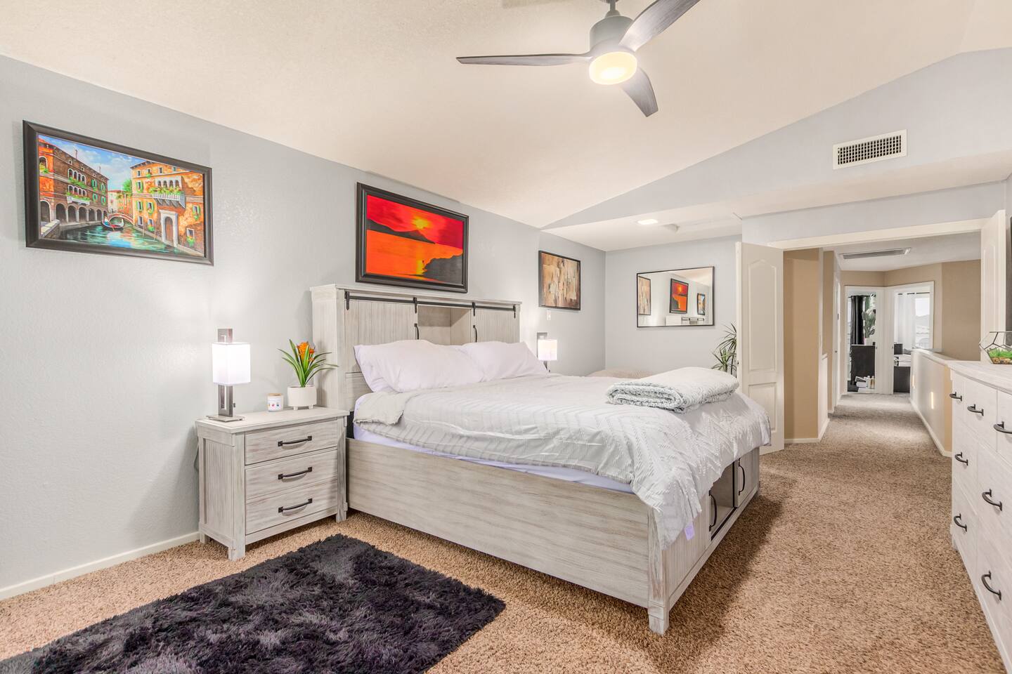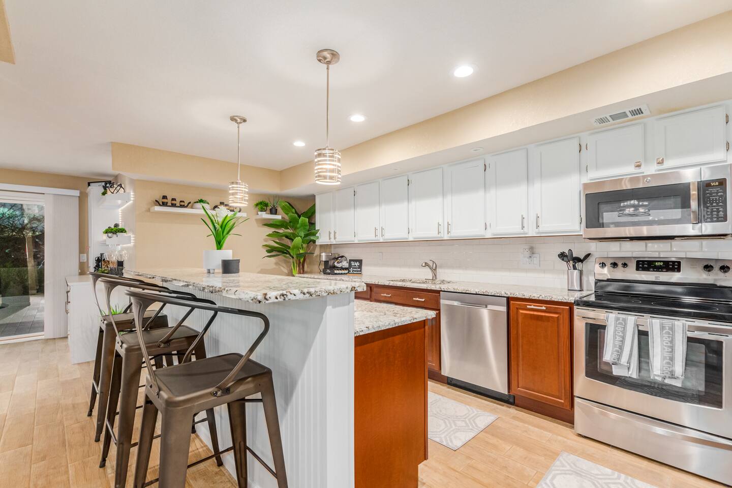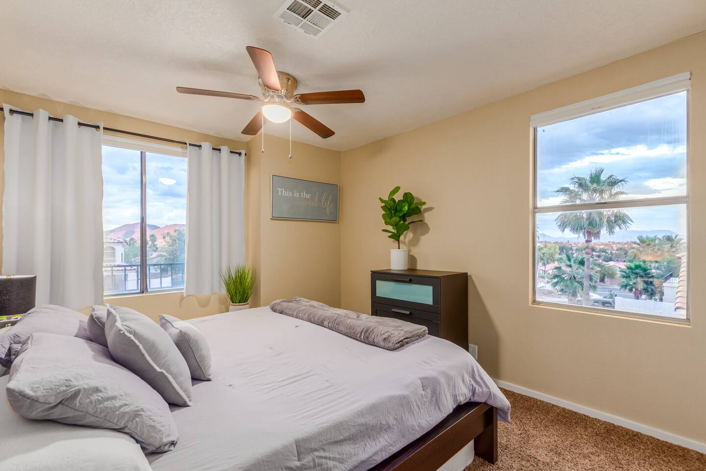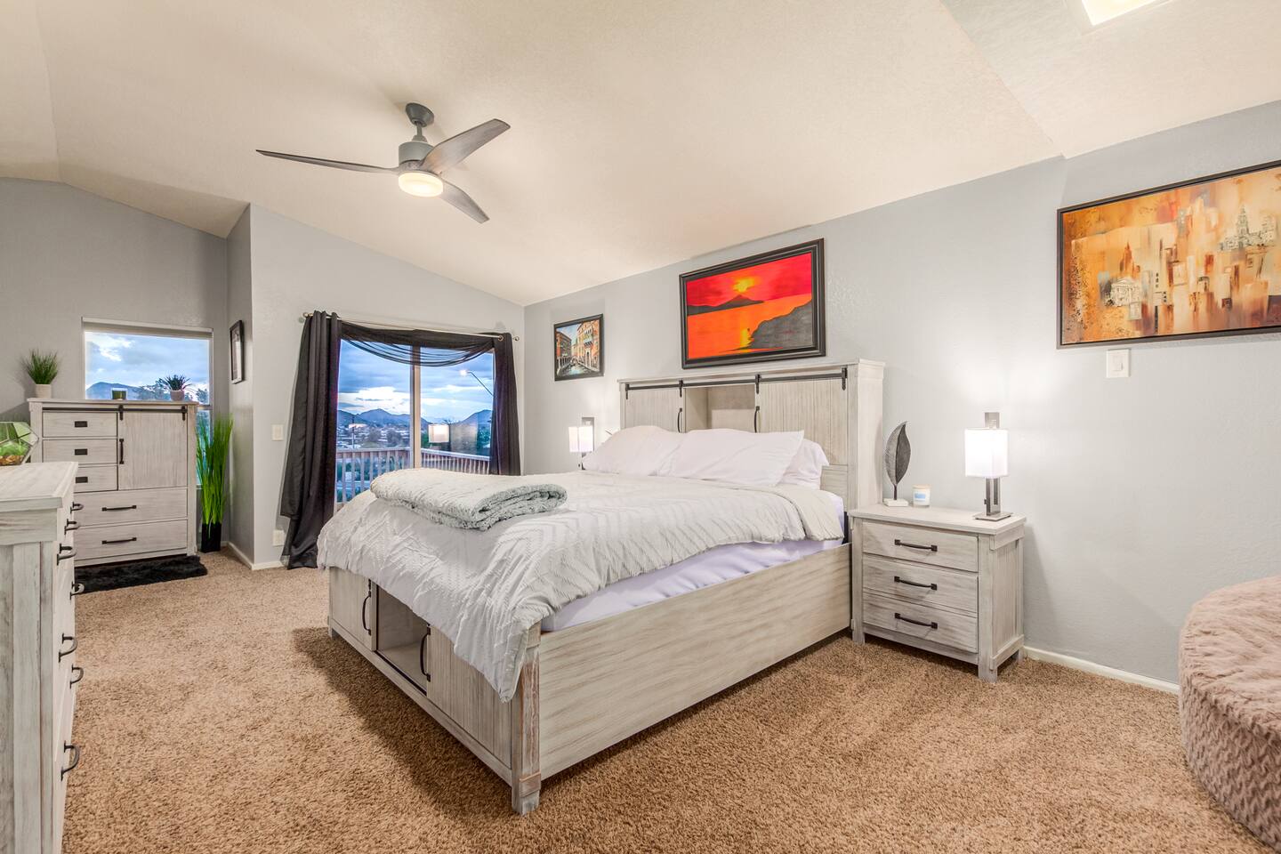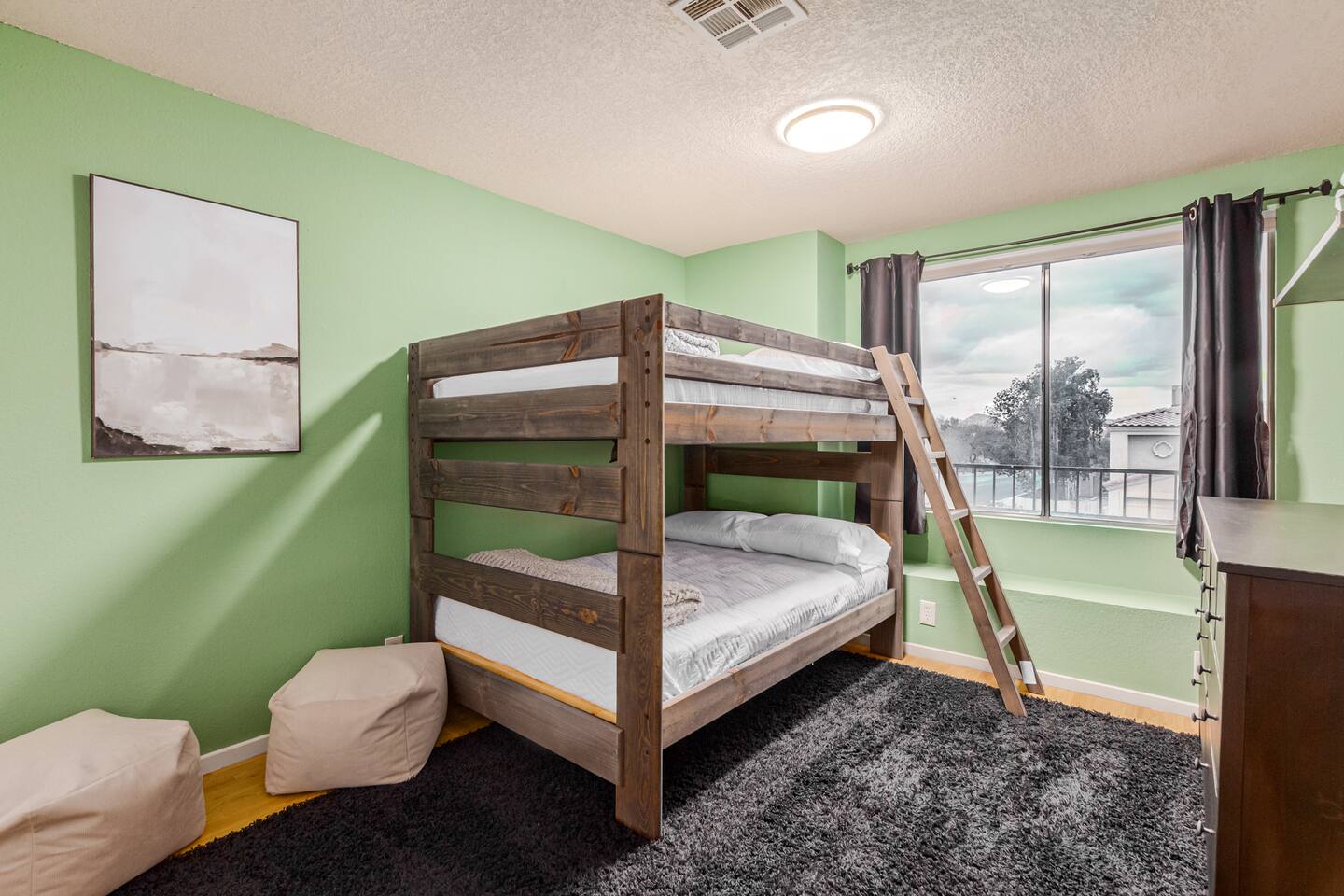 This is a spacious 2000 Sqft two story home w/ 4 beds, 1 sofa sleeper, and 2.5 baths. Home comes w/ two huge TVs. Living room TV is a smart TV so that you can log in to your personal Netflix, Hulu, etc. Sleeping areas: Master Bedroom - King bed Bedroom 2 - Kind bed Bedroom 3 - Bunk bed (2 Fulls) Bedroom 4 - Sofa Sleeper (Queen); accessed through the master bedroom Couch is big enough to sleep one as well Kitchen: Comes fully stocked w/ pots, pans, plates, bowls, glasses, mugs, cooking utensils, cutlery, and a full bar setup which includes wine glasses, champagne flutes, beer mugs, margarita glasses, whiskey glasses, and shot glasses. Also included is a mini fridge for your beverages. Regular refrigerator has filtered water and ice. Dining area: Large Dining room table set that seats 6 comfortably. 3 larger bar stools at the island for additional seating. Living area: Large sectional with room to hang out and watch tv (cable included) on the massive 86" big screen Smart TV. Plenty of card games included. House comes stocked with: - Corn Hole Set - Ladder Ball - Connect4 - Giant Jenga - Cards - Card games - Log in access to streaming services Laundry room area: - Full washer & dryer Outside area: - Artificial turf - Grill - Gas fire pit w/ 4 chairs - Lounge chairs - Outdoor sectional Outdoor string lighting - Solar lava lights - Plenty of insta-worthy backdrops - Pool (pool lights) - Heated Pool ($75 per day; 2 days minimum) to cover the cost of utilities. Please request 72 hours prior to booking. We will send a separate payment for this through the Airbnb app. In the summer months of July, August, and September, the air temperature is typically warm enough to keep the pool at a nice temperature without paying for the pool heat. -- House is well equipped with: - Towels - Pool towels - Toilet paper - Paper towels - Shampoo - Conditioner - Body wash - Soap - Laundry Detergent - Trash bags - Dishwasher soap Phoenix Operating Permit #STR-2024-002869