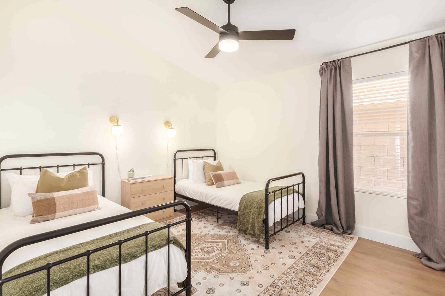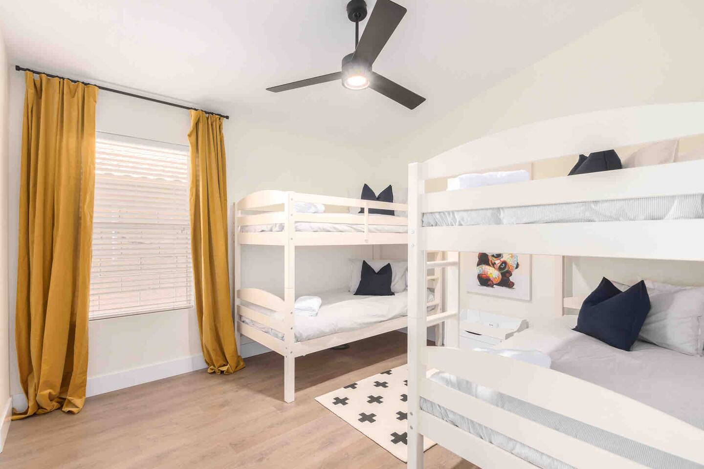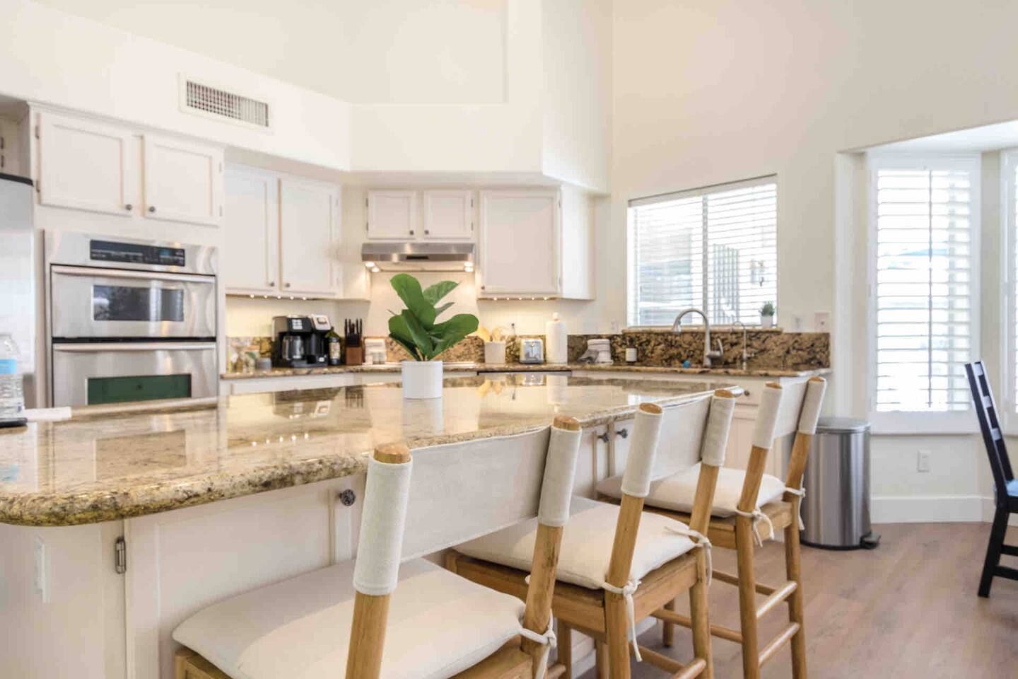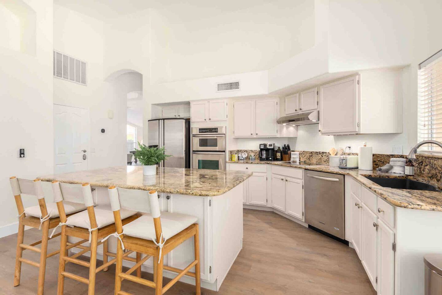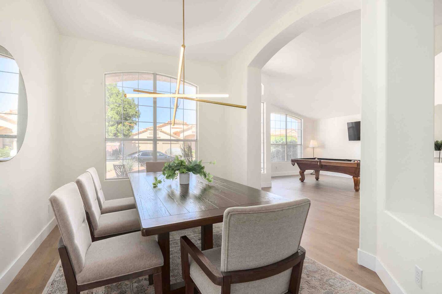 We offer several inviting indoor spaces perfect for lounging, including a cozy living room with a 65” Roku TV, a pool table room with a 55” Roku TV, and a spacious dining area that seats 8. After a round of golf at one of the many nearby courses, challenge your friends to a putting contest on our newly installed putting green. ACTIVITIES & LOCAL FOOD SCENE Adventure awaits! Enjoy easy access to hiking trails, golf courses, sporting events, shopping, and top-rated restaurants. Gilbert’s Heritage District is just minutes away, offering an incredible food scene. Be sure to check out Culinary Dropout, Snooze, and Whiskey Row! If you're here on a Saturday morning, don’t miss the Downtown Farmers’ Market for local treats. For fun nearby, visit Top Golf or Main Event. Check out our Guidebook for nightlife, brunch spots, and family-friendly activities. Staying in? Order delivery from fantastic local restaurants (we love Flower Child!) or cook in our fully equipped kitchen. ENTERTAINMENT ✔️ Putting green ⛳ ✔️ Lawn games 🎯 ✔️ Pool table 🎱 ✔️ Swimming pool 🏊 ✔️ Backyard Bluetooth speakers 🎵 ✔️ High-speed WiFi ⚡ ✔️ 65” Roku TV (Living Room) 📺 ✔️ 55” Roku TV (Pool Table Room & Master) 📺 ✔️ 43” Roku TV (King Bedroom) 📺 BATHROOMS ✔️ Shampoo, conditioner, body soap 🧴 ✔️ Hair dryer 💨 LAUNDRY ✔️ Washer & dryer 🧺 ✔️ Detergent & ironing essentials PARKING ✔️ 3 driveway spots 🚗 ✔️ Free street parking KITCHEN ✔️ Fully stocked with cookware 🍽️ ✔️ Instant Pot & toaster 🔥 ✔️ Coffee & K-cup machine ☕ ✔️ Sharp knives & wine glasses 🍷 ✔️ Dishwasher, oven, microwave DINING ✔️ Main dining table (seats 8) 🍽️ ✔️ Kitchen table (seats 4) BEDROOMS 🛏 Master – King bed, pool view, desk, walk-in closet, 55” Roku TV, luggage stand, USB charging, ceiling fan 🛏 Bedroom 2 – King bed, 43” Roku TV, luggage stand, USB charging, ceiling fan 🛏 Bedroom 3 – Two bunk beds, USB charging, ceiling fan 🛏 Bedroom 4 – Two twin beds, USB charging, ceiling fan We can’t wait to host you! 🎉